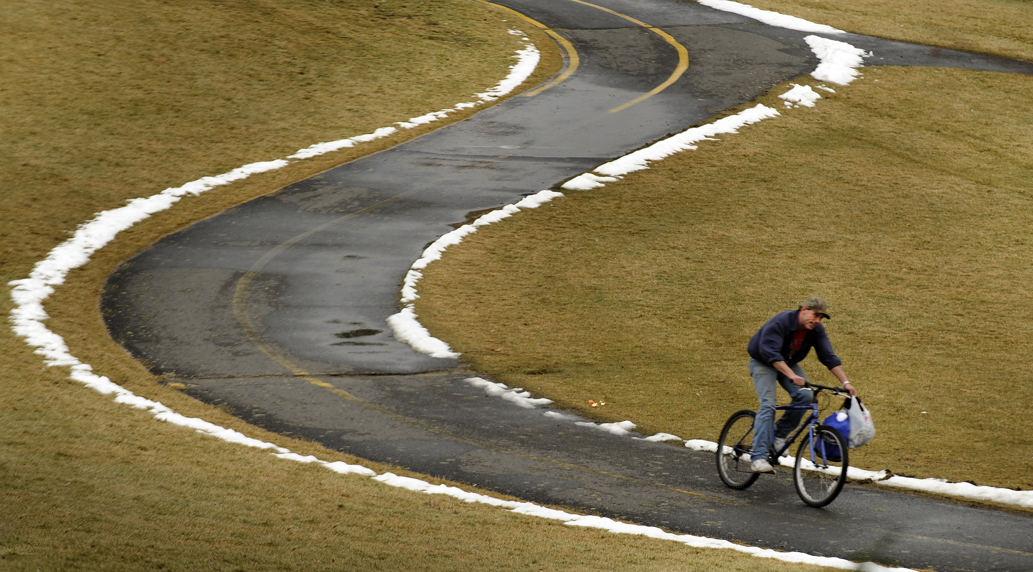 A cyclist serpentines his way through the remnants of Monday’s snowfall in Riverfront Park Thursday afternoon. (Colin Mulvany/SR)