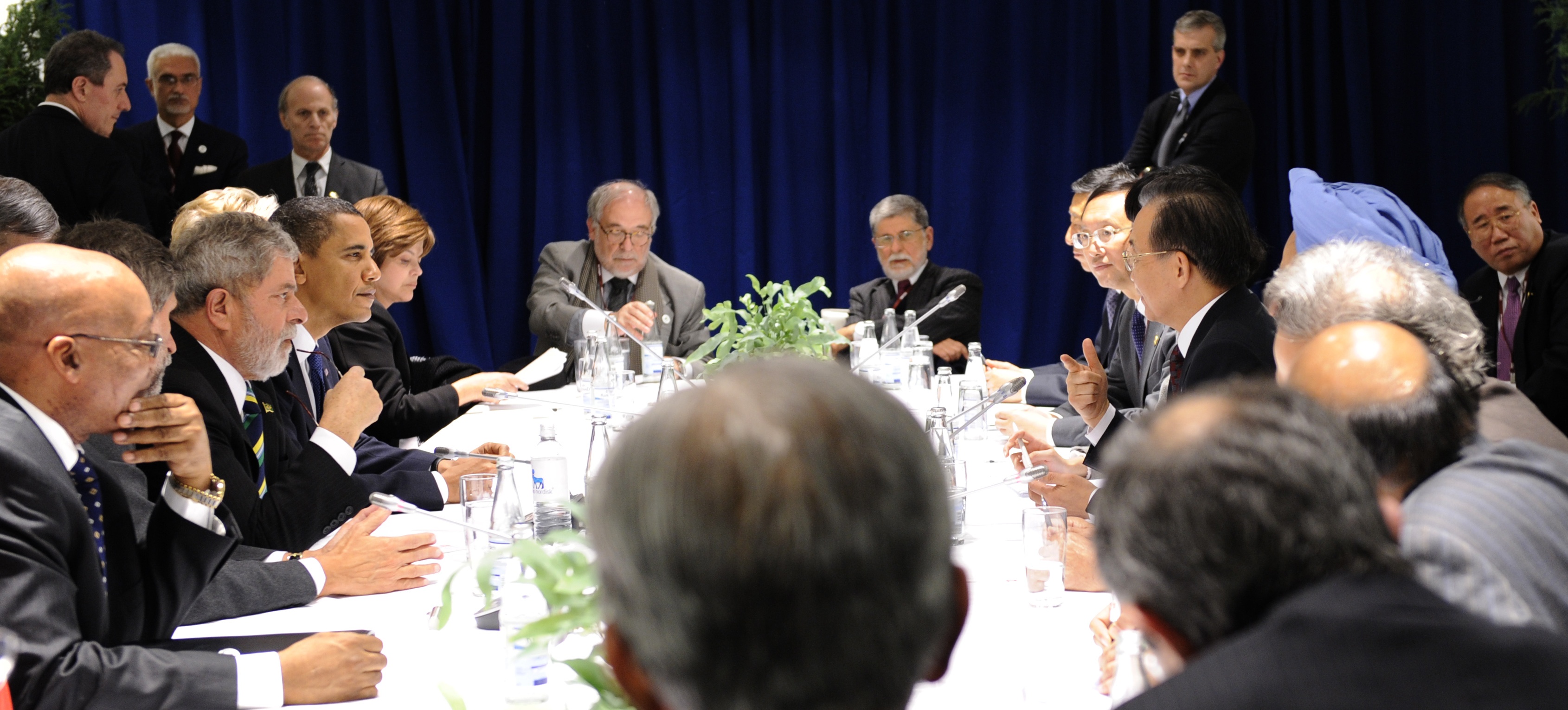 President Barack Obama, 4th left, is joined by other leaders in a multilateral meeting at the United Nations Climate Change Conference at the Bella Center in Copenhagen, Denmark, today. (AP Photo/Susan Walsh)
