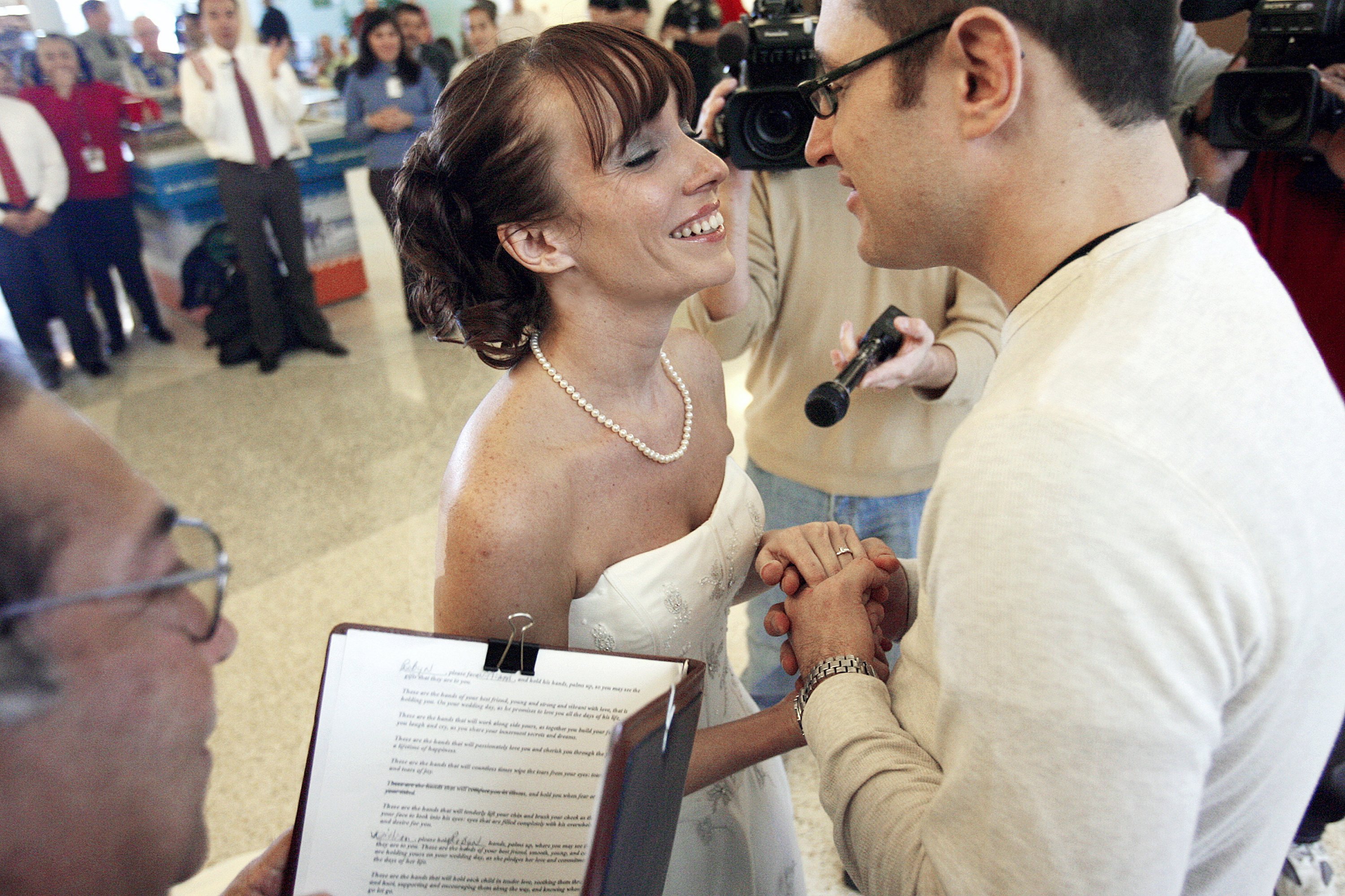 Robyn Moore with her fiancee, William Acosta, right, exchange vows at the Corpus Christi, Texas International Airport on Monday after his arrival from Toledo, Ohio. Robyn Moore was at the airport waiting for him in her wedding dress with Justice of the Peace, Robert “Bobby” Balderas, below left, who married them on the spot. Story here . (AP Photo/Corpus Christi Caller-Times, George Gongora)