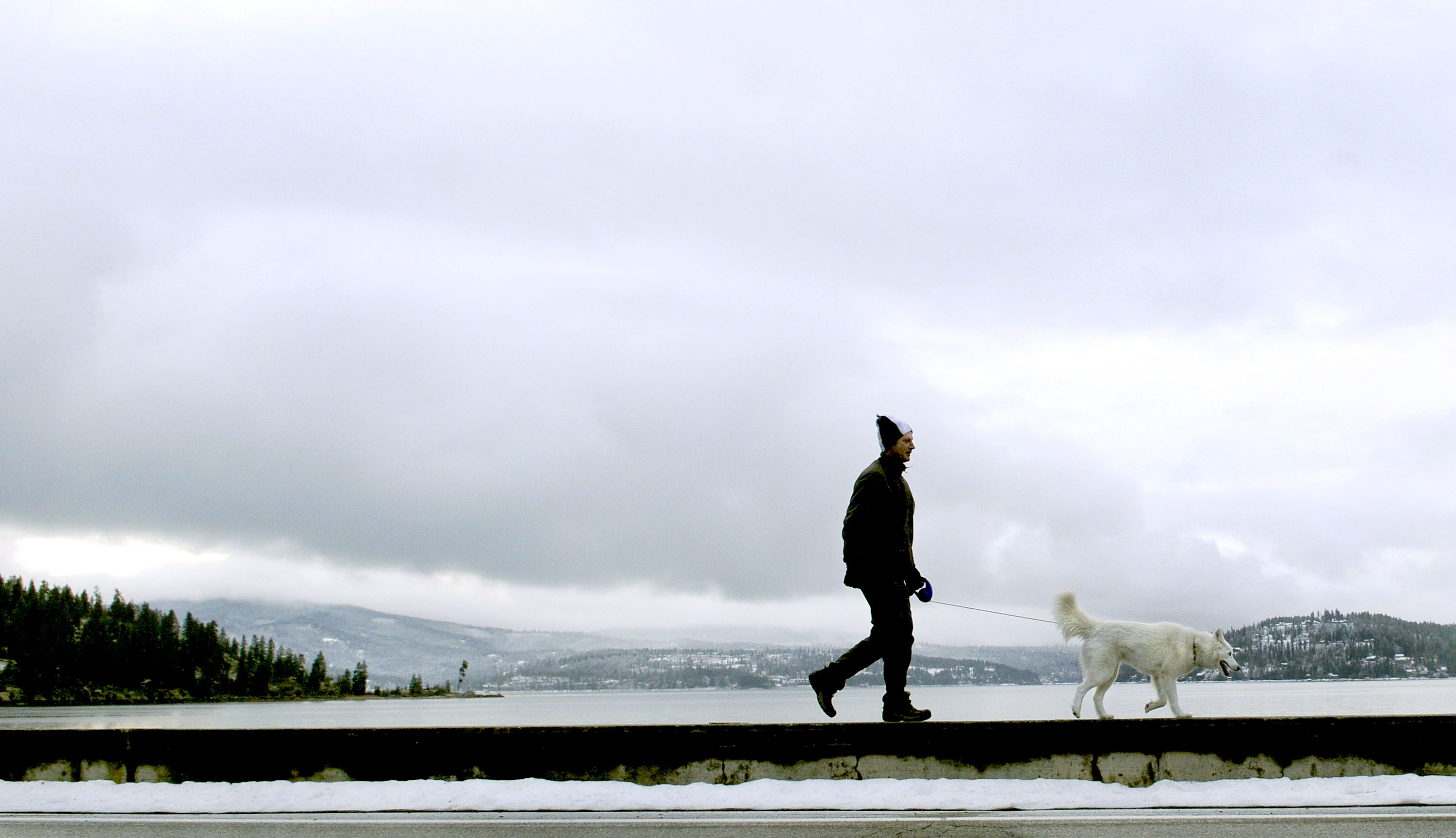 Bob Freer walks on top of the cement wall near Coeur d’Alene City Park with his dog Salty on Tuesday in Coeur d’Alene. Freer is from Coeur d’Alene. (Kathy Plonka/SR)