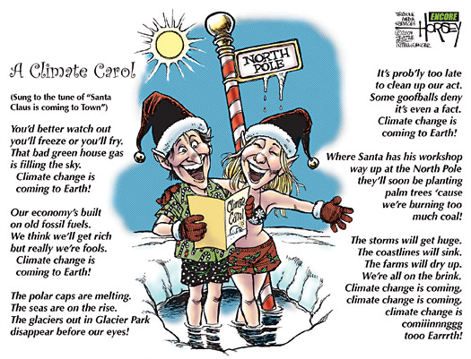 Strictly in the Spirit of the impending Christmas Season, once again I present cartoonist David Horsey’s Climate Carol, an irreverent play on that old favorite, “Santa Claus is Coming to Town”.