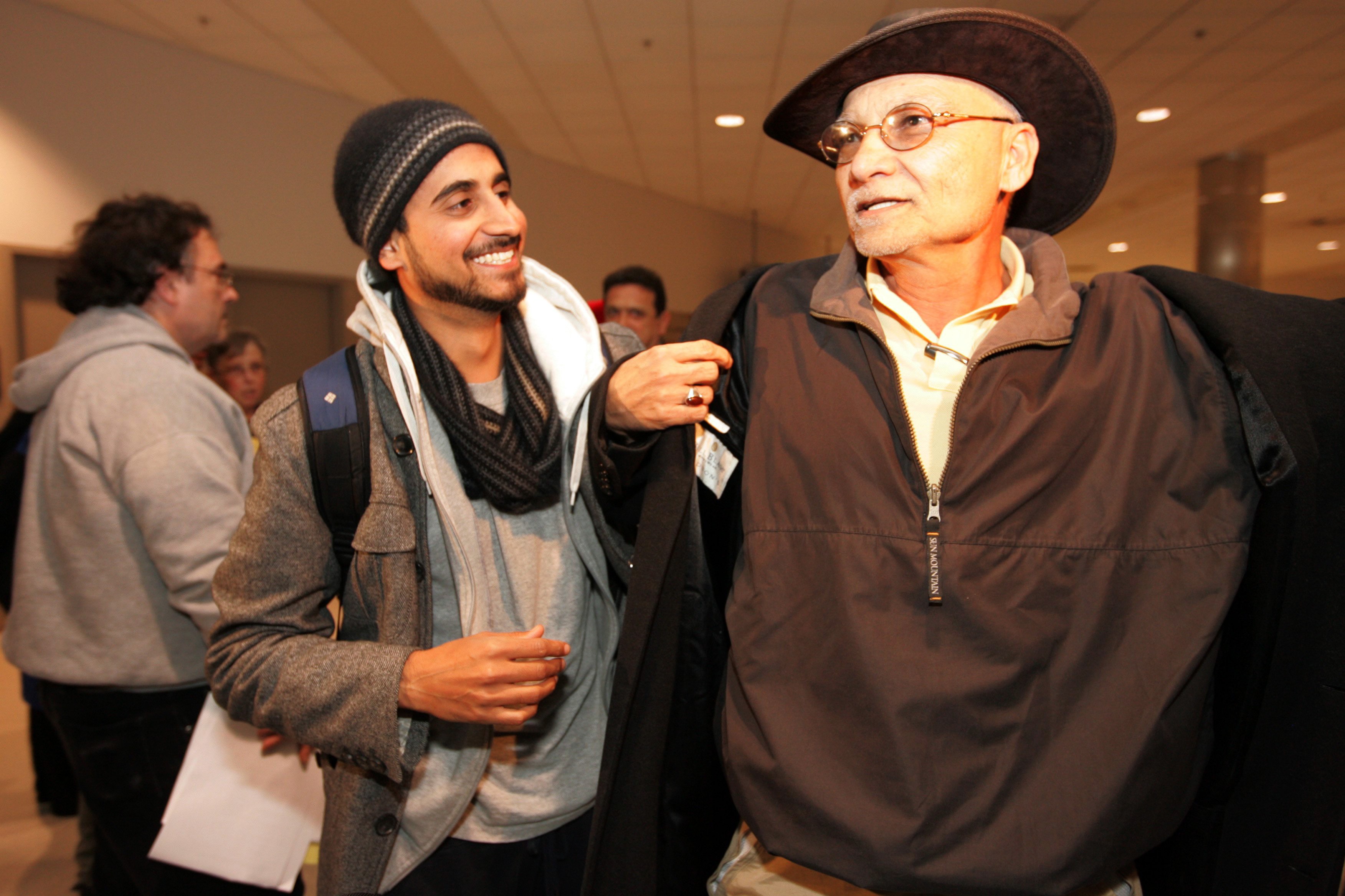 Zan Jafry, left, helps his father Syed Jafry with his coat after arriving on a Northwest Flight from Amsterdam at Detroit Metropolitan Airport in Romulus, Mich. on Friday, Dec. 25, 2009. A Northwest Airlines passenger from Nigeria, who said he was acting on al-Qaida’s instructions, tried to blow up the plane Friday as it was landing in Detroit, law enforcement and national security officials said.
