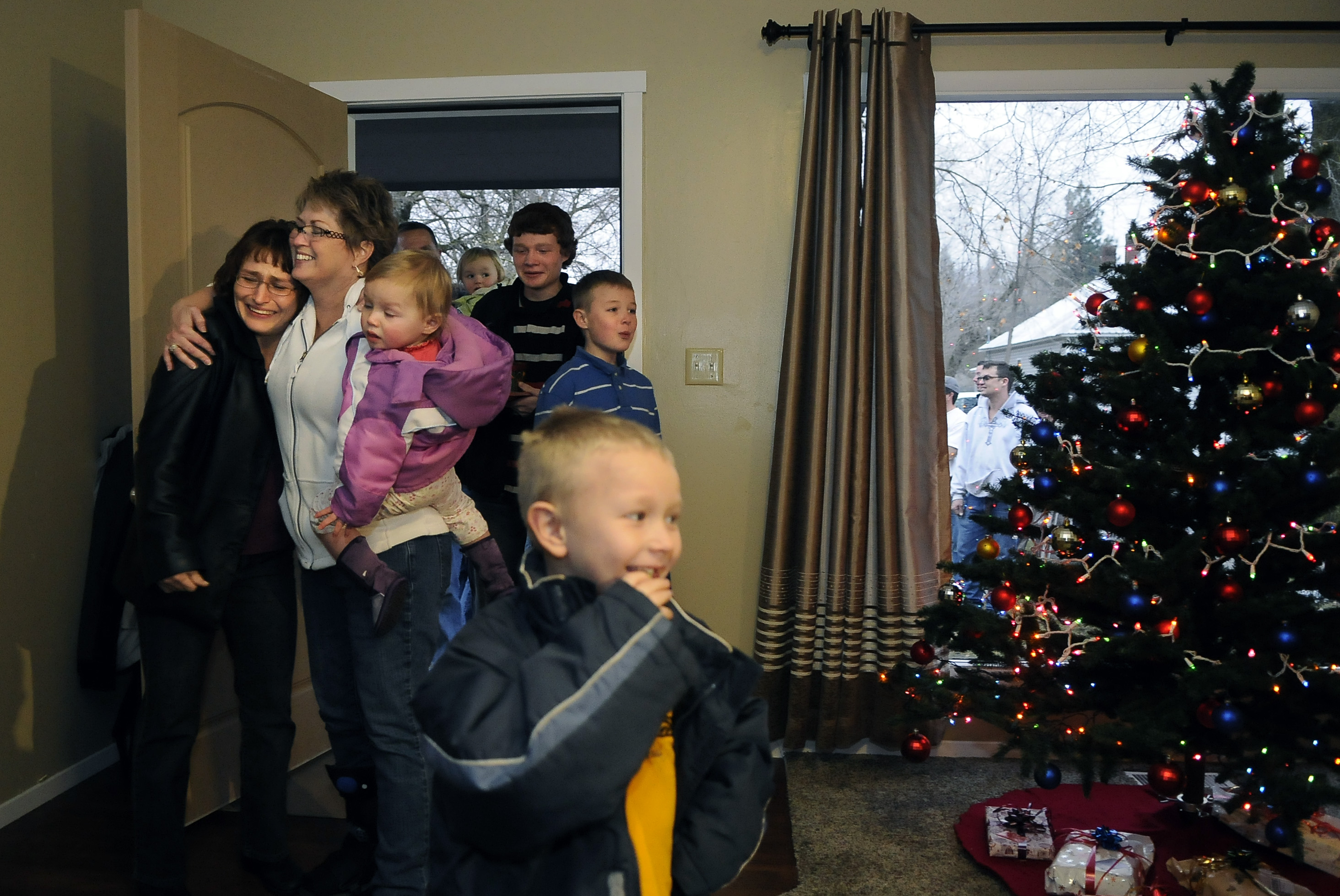 Leslie Nelson, left, gets a hug from Deb Farnsworth as they enter Nelson’s remodeled home.