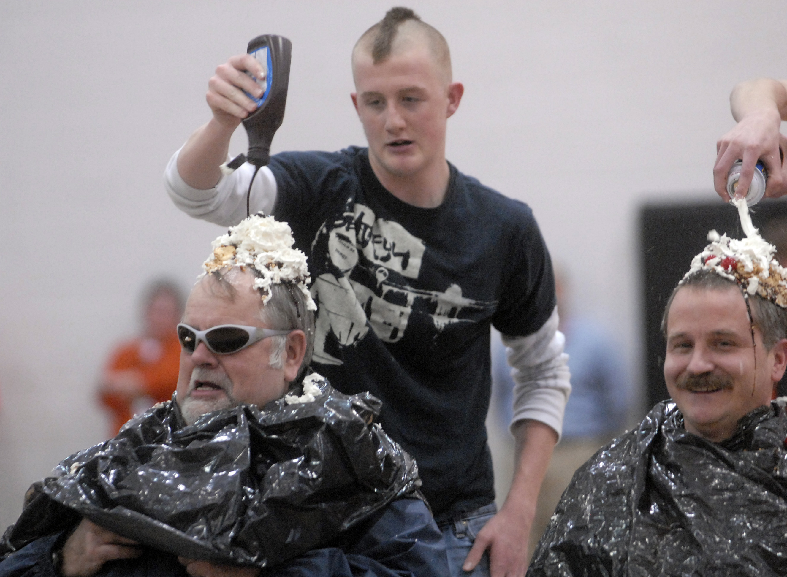 Junior Devon Bryant adds chocolate to the “Sundae” that he created on Post Falls HS advanced placement govenment/history teacher Skip Eagle during the “Spirit Competition” prior to the Trojans “Prairie Pig” rivalry games with Lakeland HS recently. Both the Post Falls boys and girls teams were victorious on the basketball court that evening. J. Bart Rayniak/SR.