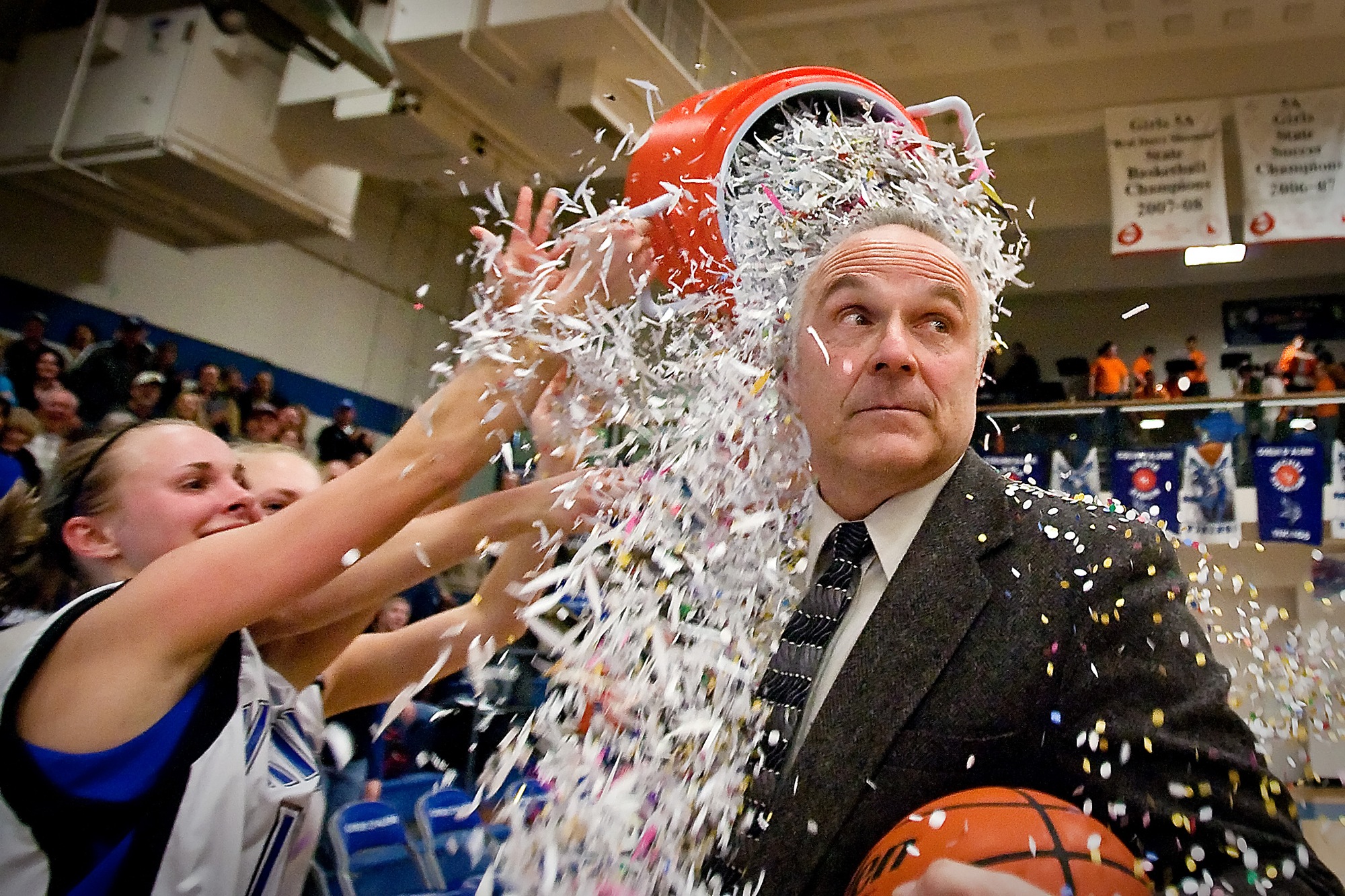 Coeur d’Alene high school head coach Dale Poffenroth looks toward the crowd a moment before he is covered with confetti by Sadie Simon, left, a senior guard for the Vikings, following his team’s 5A Region 1 championship win Tuesday over Post Falls High in Coeur d’Alene. CDA Press story here . (AP Photo/Coeur d’Alene Press, Jerome A. Pollos)