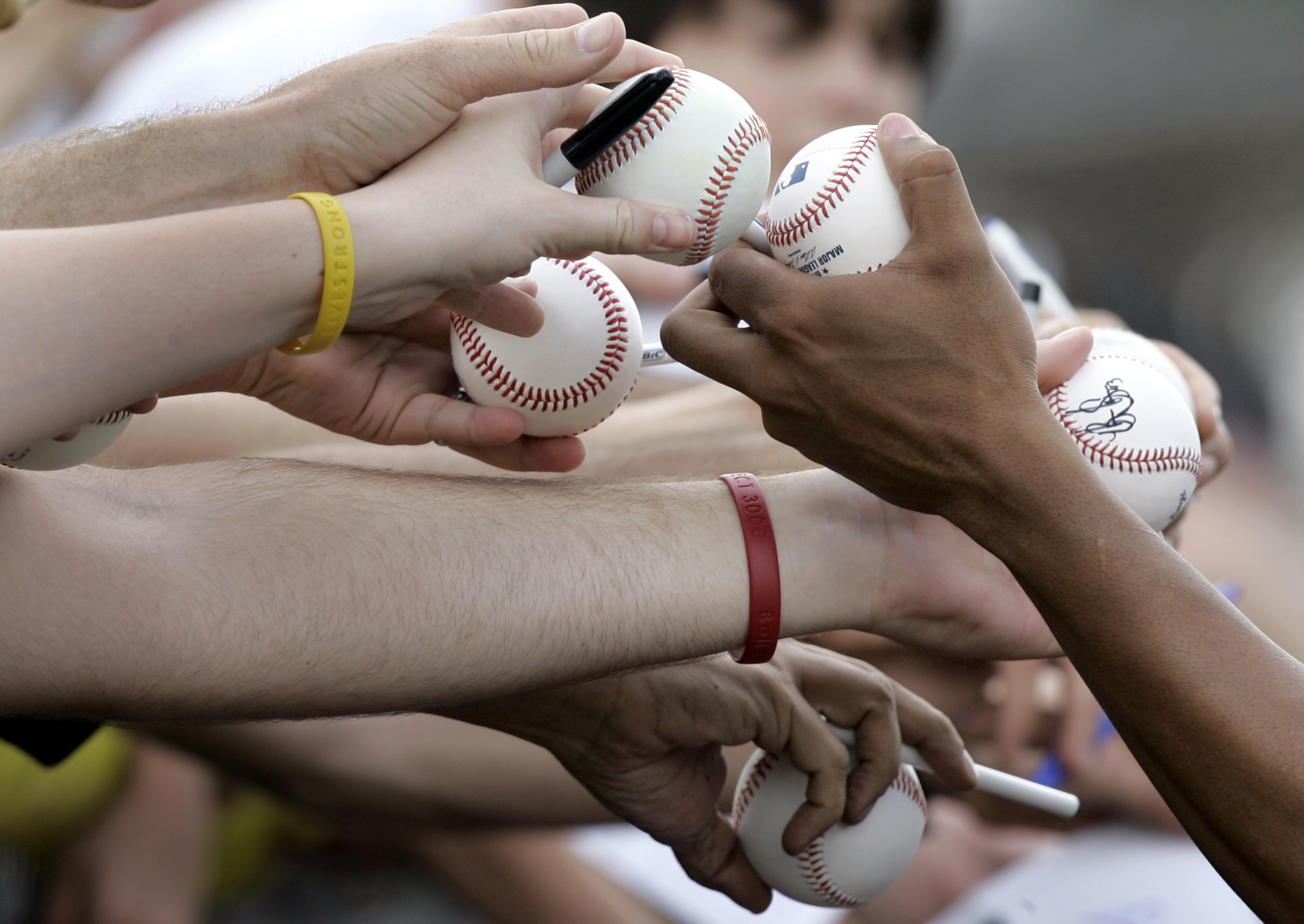 New York Mets pitcher Francisco Rodriguez hands a ball back to an autograph seeker during spring training baseball Sunday in Port St. Lucie, Fla. (AP Photo/Jeff Roberson)