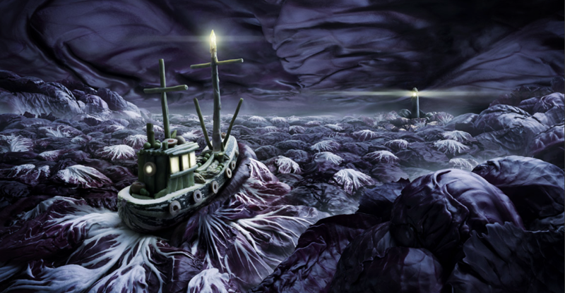io9.com brings some life to this piece as a “black olive-and-watermelon ship sails through a sea of cabbage seeking revenge on vegeterians who have virtually annihilated the entire fruit and vegetable population…”