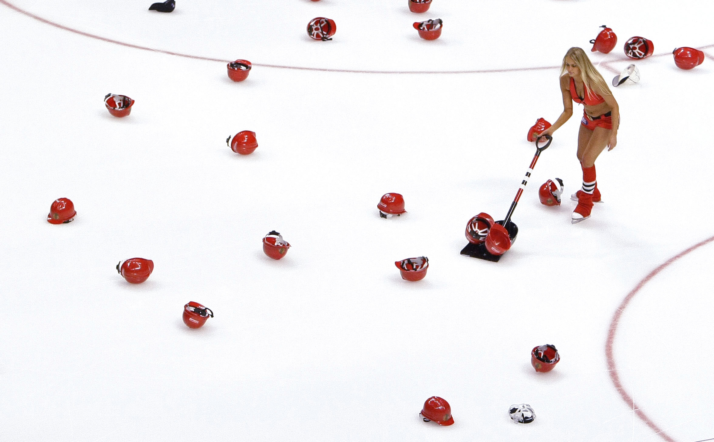 A member of the Chicago Blackhawks Ice Crew gathers up helmets and hats after Chicago Blackhawks center Jonathan Toews scored a hat trick during the third period of their NHL game against the Pittsburgh Penguins in Chicago Friday. You write the cutline. (AP Photo/Charles Rex Arbogast)