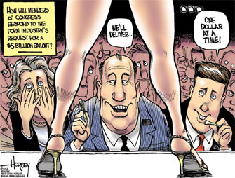 Since we have the face of the porn industry itself, Hustler’s Larry Flynt, gracing the pages of Community Comment, but before anyone faints dead away, let us allow David Horsey to weigh in, if you please. I think we should have a show of hands of every member of government who regularly invests in pornography. (Looking at the chagrin on all the faces of our elected representatives and former representatives) Surprise surprise!