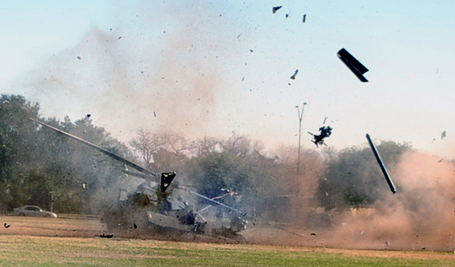 Debris flies in all directions as an Army Blackhawk helicopter crashes in a field at Texas A&M University in College Station, Texas, today. (AP Photo/Dave McDermand, Bryan-College Station Eagle)