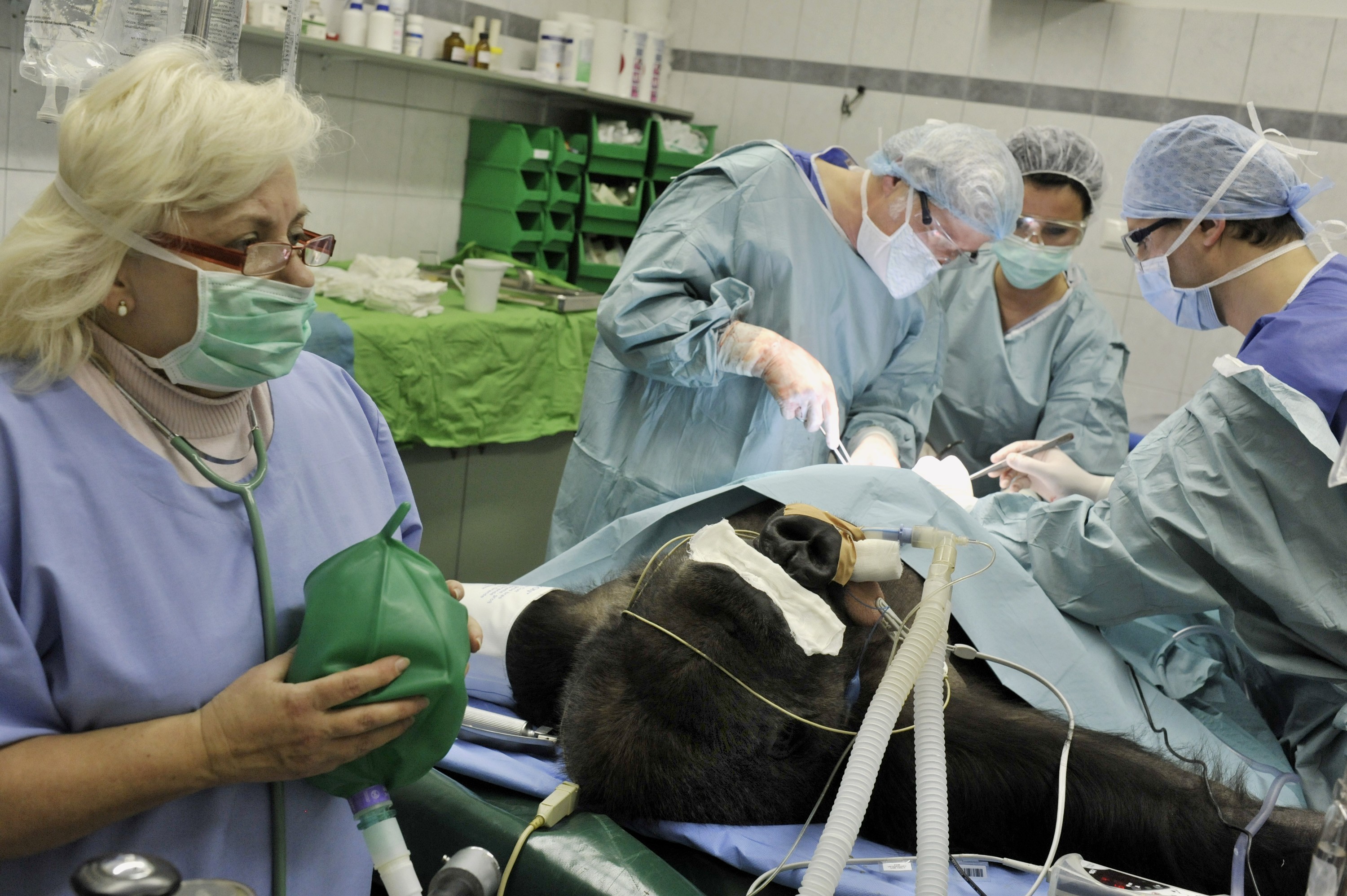 Veterinarians operate the Budapest Zoo’s oldest gorilla Liesel in Budapest, Hungary, earlier today. The surgery became needful due to a progress of tumor, which could cause the death of the ape. During the three hours long intervention, human doctors with assistance of the zoo’s veterinarians checked the 32 years old, female, low land gorilla’s fibroids in the uterus, which is anatomically very similar to the human body. Worldwide any surgeries on gorillas are extremely rare; and this was the first time that this kind of intervention became mandatory in Hungary. (AP Photo/Bela Szandelszky, POOL)