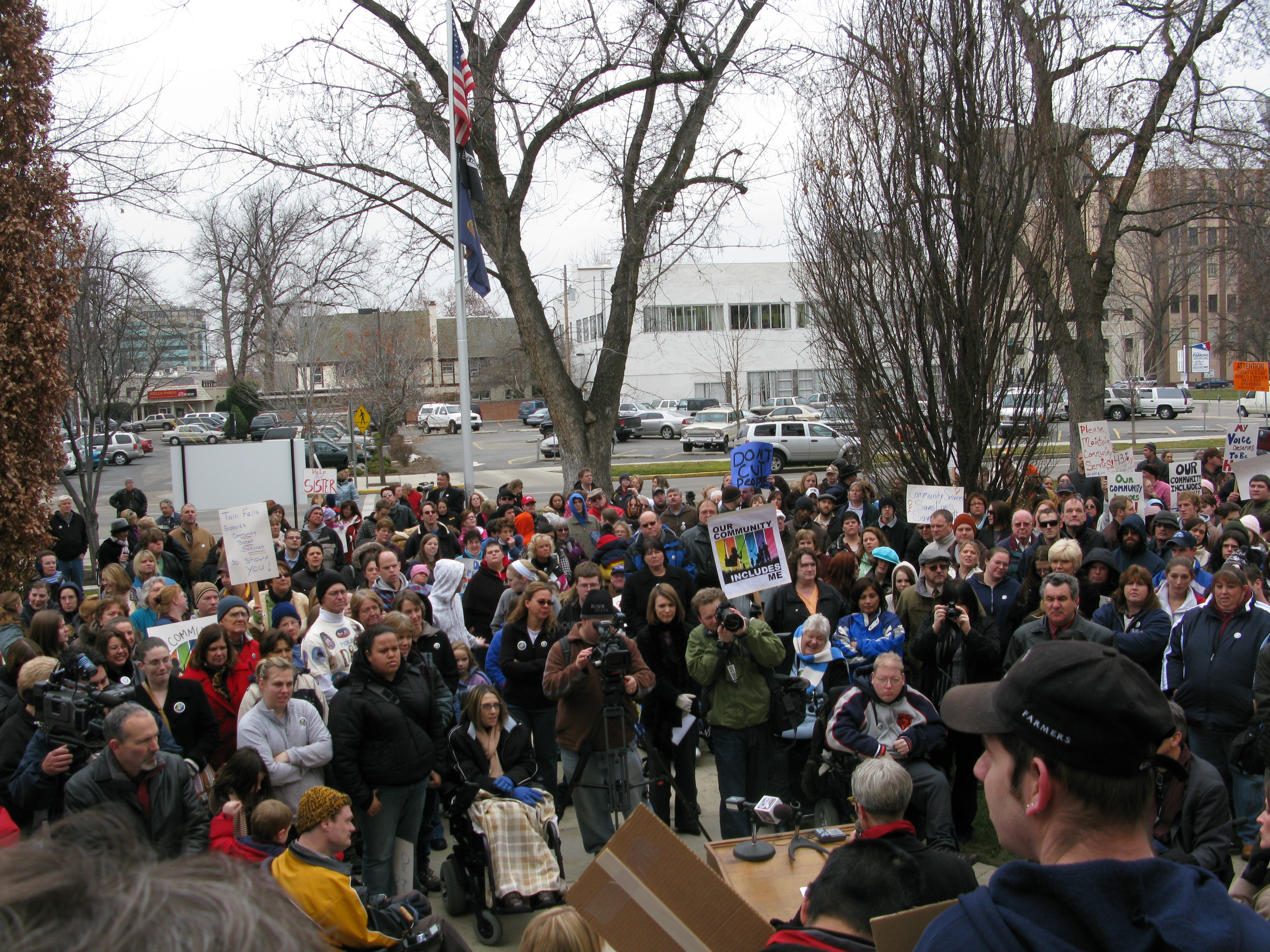 Hundreds of disabled people, family members and advocates marched to the Capitol Annex this afternoon and rallied outside to oppose cuts in state services to the disabled. “I’m just like everybody else - I want to have my own apartment, I want to work, I want to help make it better for the next generation of people with disabilities,” Mike Smith, 45, of Moscow told the crowd from his wheelchair, struggling with the words. Smith, who was born with severe cerebral palsy but works and lives on his own, has such difficulty speaking that a helper then reread his speech for him so everyone could understand it. People in the crowd held signs saying, “No Medicaid Cuts,” “Our Community Includes ME,” “Services keep me home” and “Do you enjoy living in your own home? So does my son!” One woman held a toddler bundled in pink, along with a sign saying, “I am the face of the governor’s holdbacks.”
