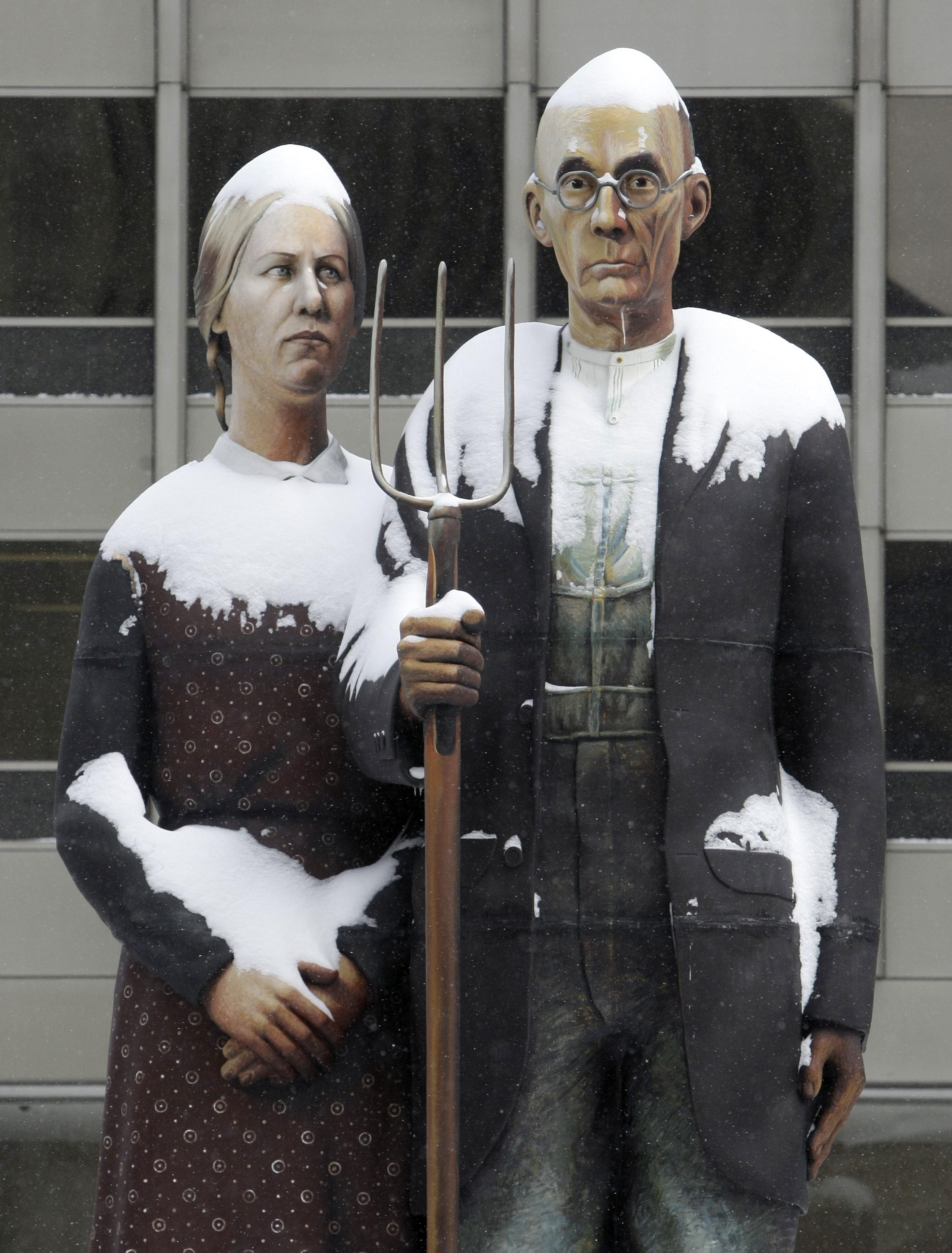 The 25-foot statue titled “God Bless America” by J. Steward Johnson, inspired by Grant Wood’s painting “American Gothic,” accumulates snow near the Chicago River on Chicago’s Magnificent Mile Wednesday. (AP Photo/Charles Rex Arbogast)