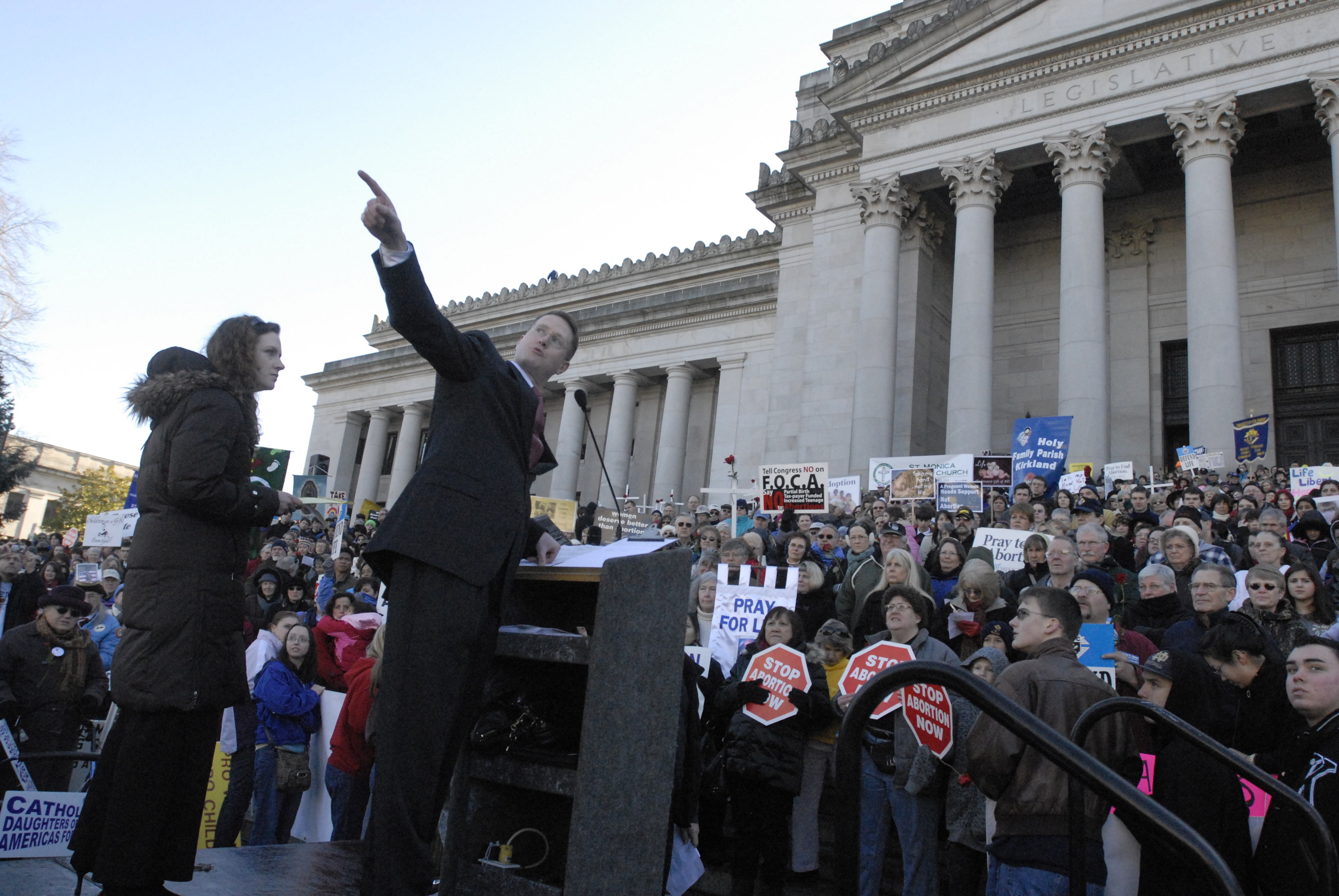 “Let’s make sure the Supreme Court can hear all of us today,” newly elected state Rep. Matt Shea, R-Mead, said. He dismissed the dozen counter-demonstrators on the state Supreme Court steps as “static” and led the crowd in a chant: “Life, life, life, life!”