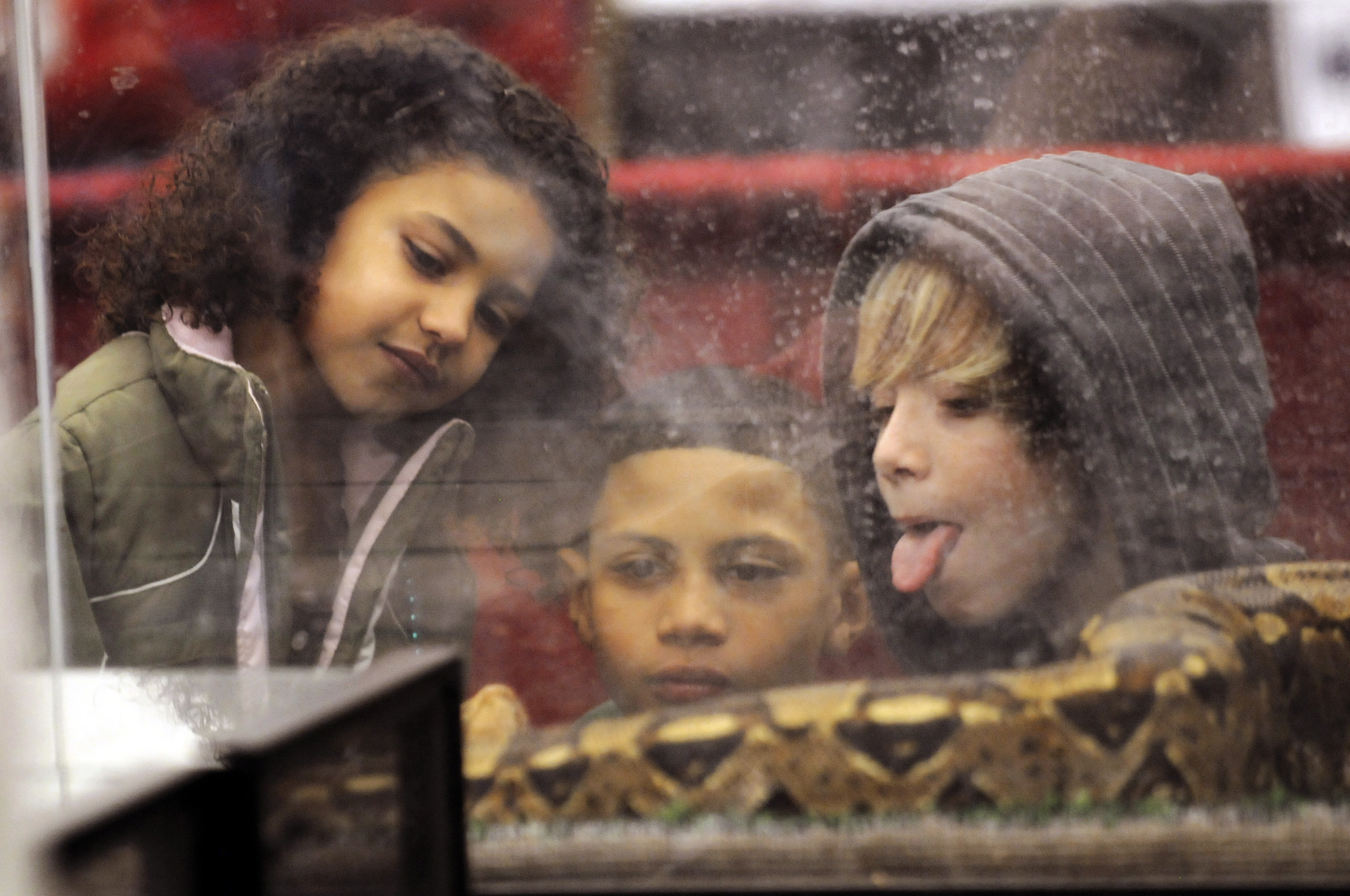Patrick Adair, 12, of Nampa, Idaho, right, sticks our his tongue as he gets a close look at a common boa constrictor with Olivia Fisher, 5, left, and Isaiah Fisher, 12, middle at the aquarium displays set up by the Idaho Herpetological Society at the Saturday at the Nampa Civic Center. (AP Photo/Idaho Press-Tribune, Greg Kreller)