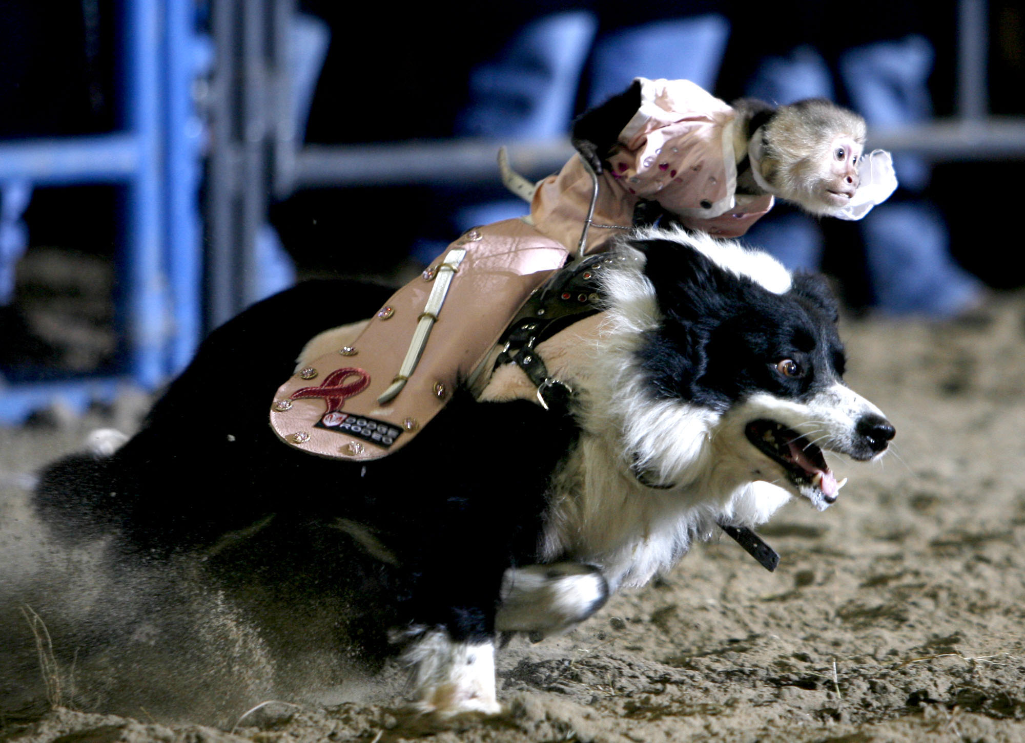 Dawn rides atop Dan, a border collie, during a break in bull riding action at the Fear No Evil Bull Riding Challenge on Saturday in Houma La. The act featured two monkey-toting collies rounding up a herd of rams. You write the cutline. (AP Photo/The Houma Courier, Matt Stamey)