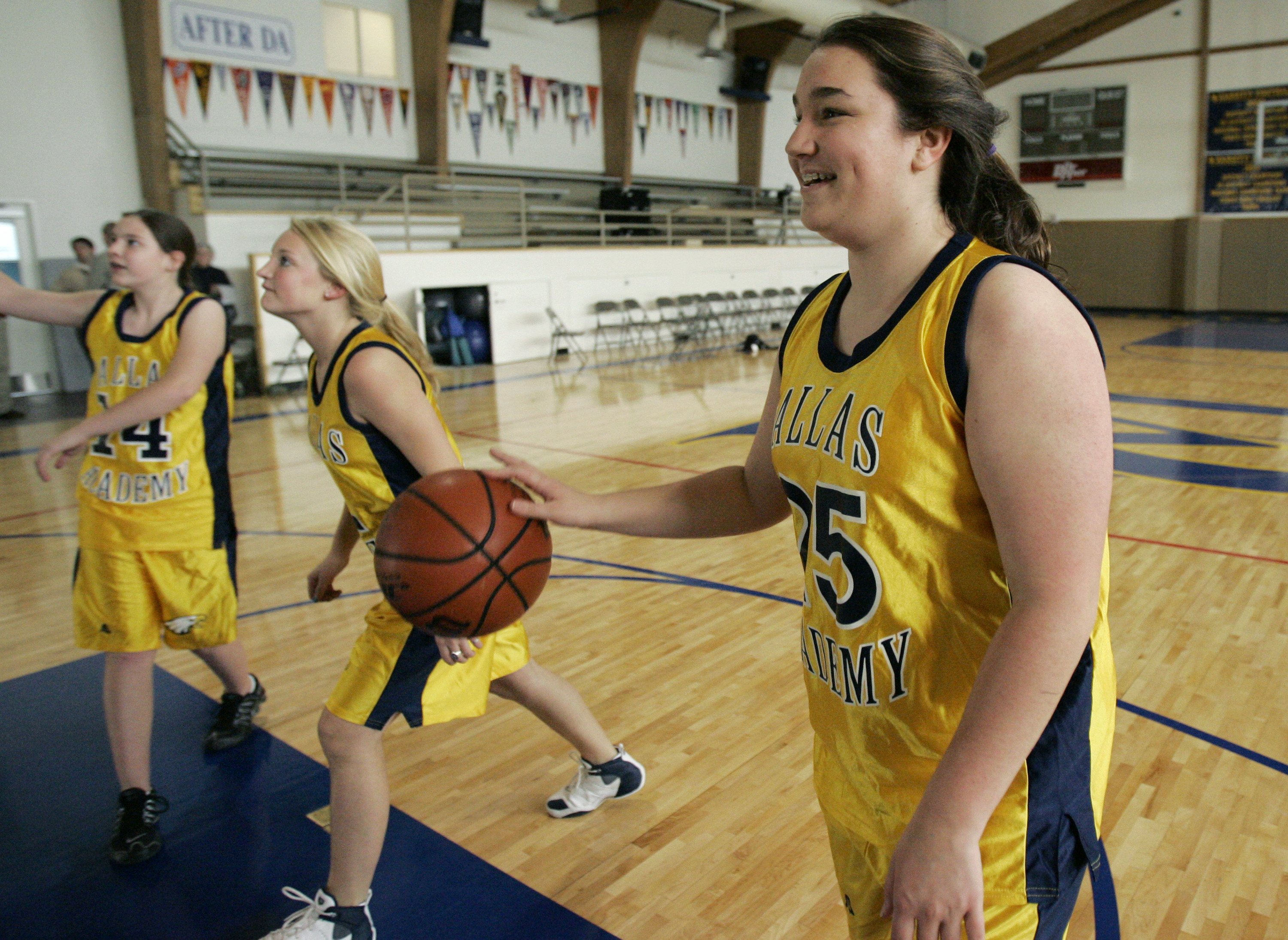 Dallas Academy’s Shelby Hyatt, from left, Lauren Click, center, and Eleanor Callan, right, participate in a shoot-around in the schools gymnasium in Dallas Thursday. Covenant, a private Christian school in Dallas, defeated Dallas Academy 100-0 last week. (AP Photo/Tony Gutierrez)