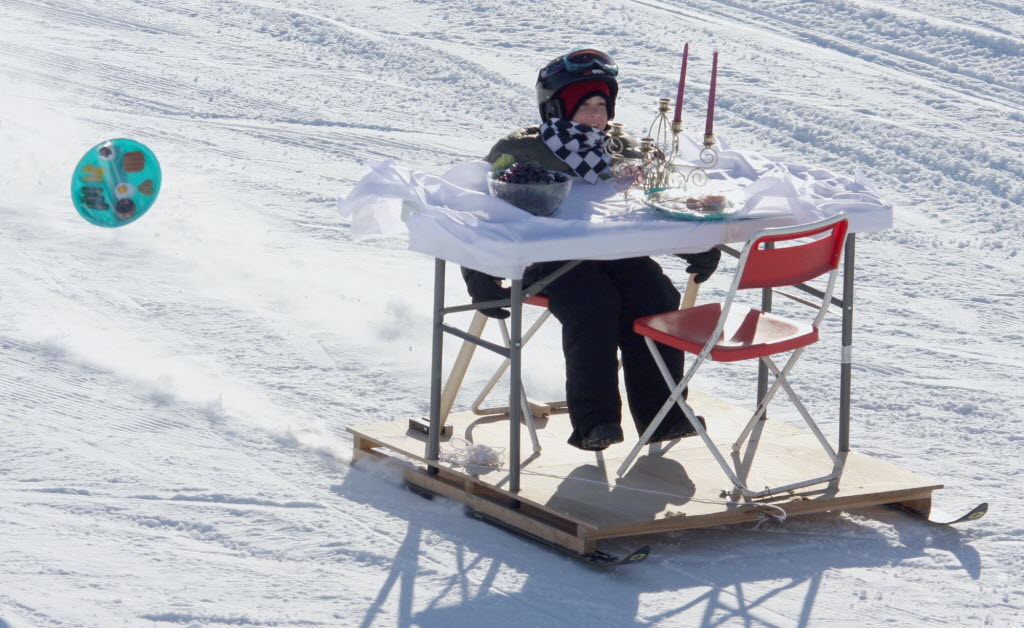 A plate flies off a table set for two as Mason Hill, 8, rides down the hill at the 4th annual furniture races at the Bruce Mound Winter Sports Area near Neillsville, Wis., Saturday. You write the cutline. (AP Photo/Marshfield News Herald, Dan Young)