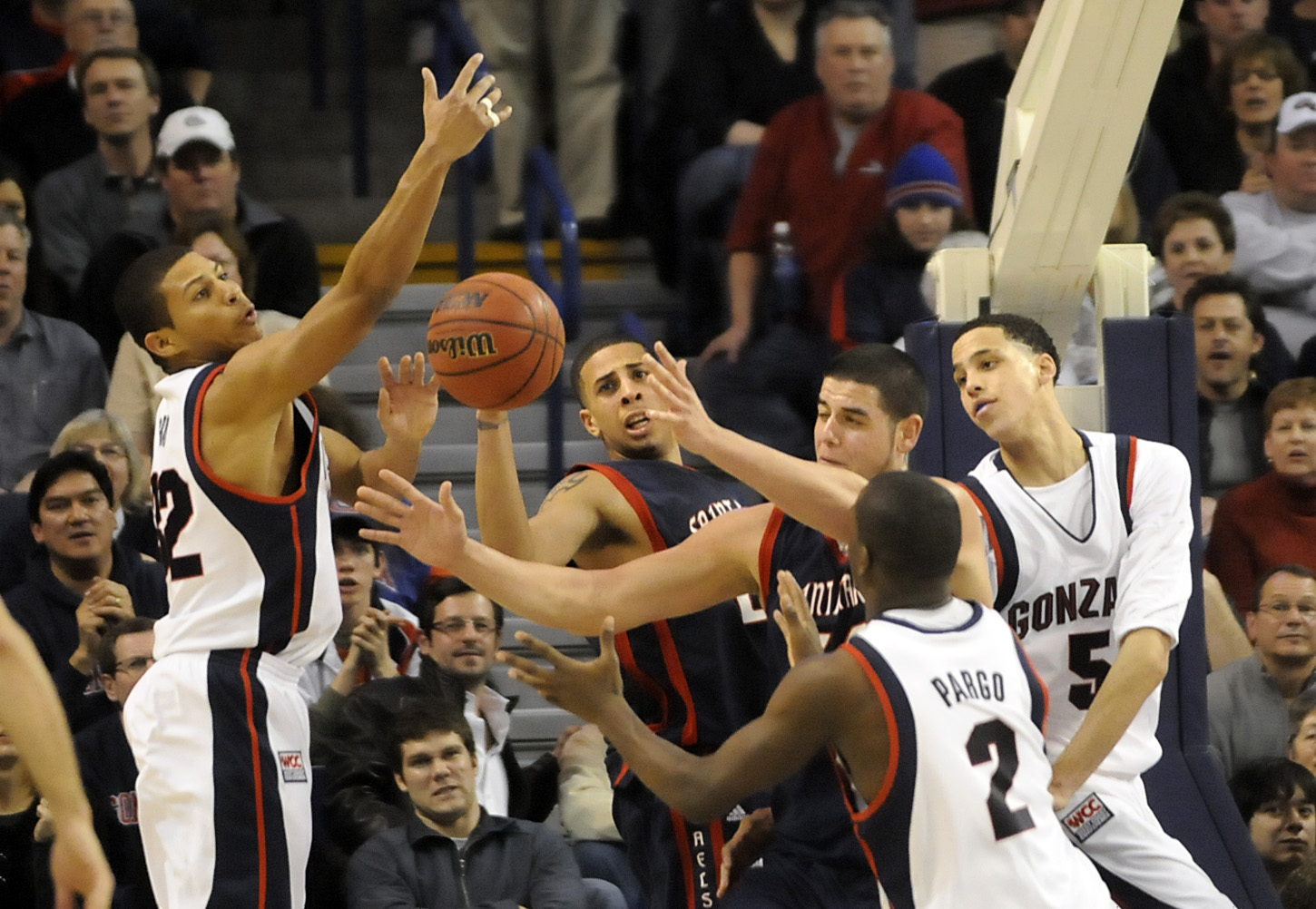 Gonzaga’s Steven Gray, Saint Mary’s Diamon Simpson and Omar Samhan and GU’s Jeremy Pargo and Austin Daye battle for a rebound in the second half of the West Coast Conference matchup Thursday at the McCarthey Athletic Center at GU. Jim Meehan’s SR game story here . ESPN boxscore here . More photos . (Jesse Tinsley/SR)