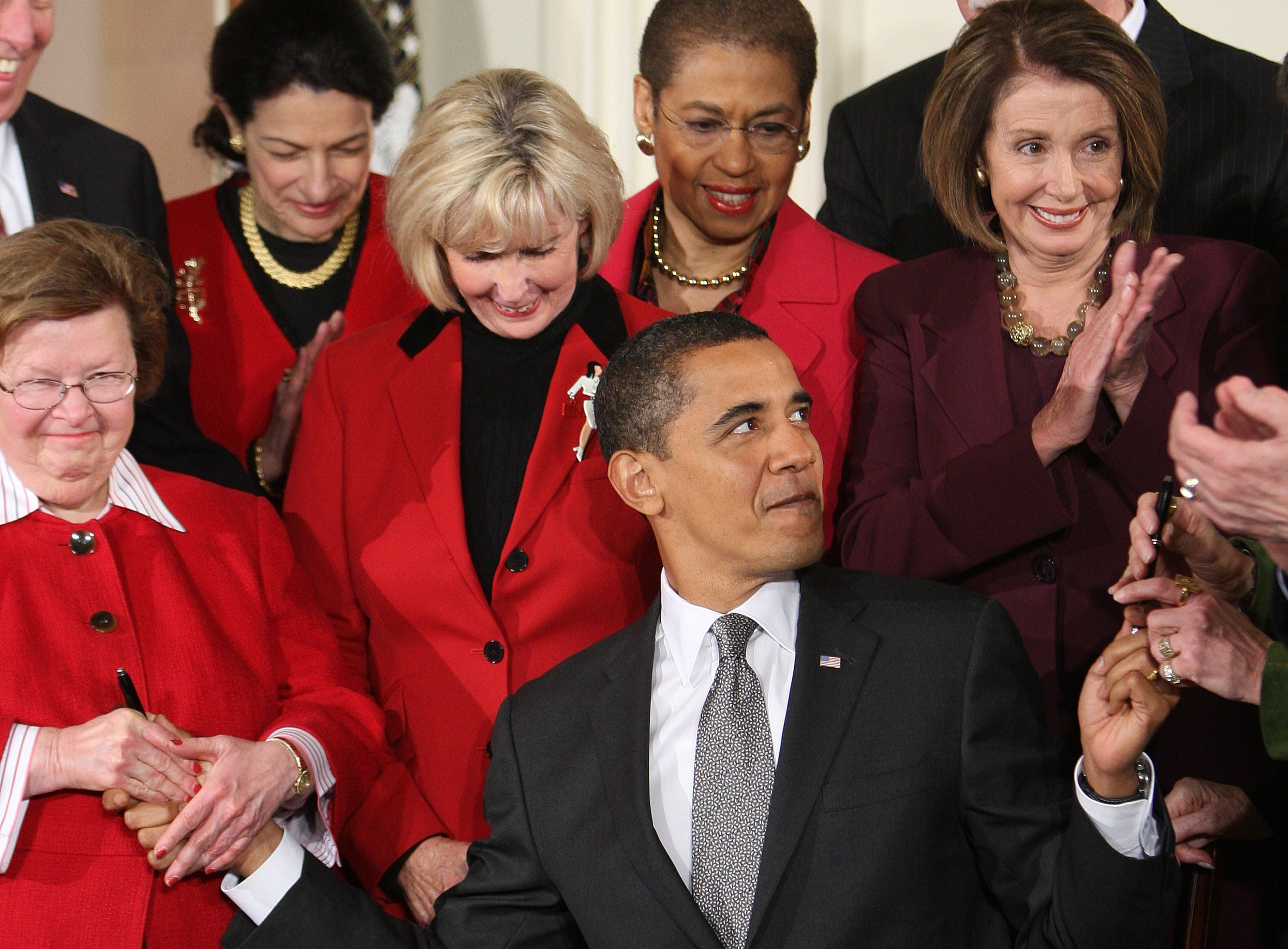 Surrounded by members of Congress President Barack Obama hands out pens after signing the Lilly Ledbetter Fair Pay Act with Lilly Ledbetter, standind left of Obama, Thursday, Jan. 29, 2009, in the East Room at the White House in Washington.