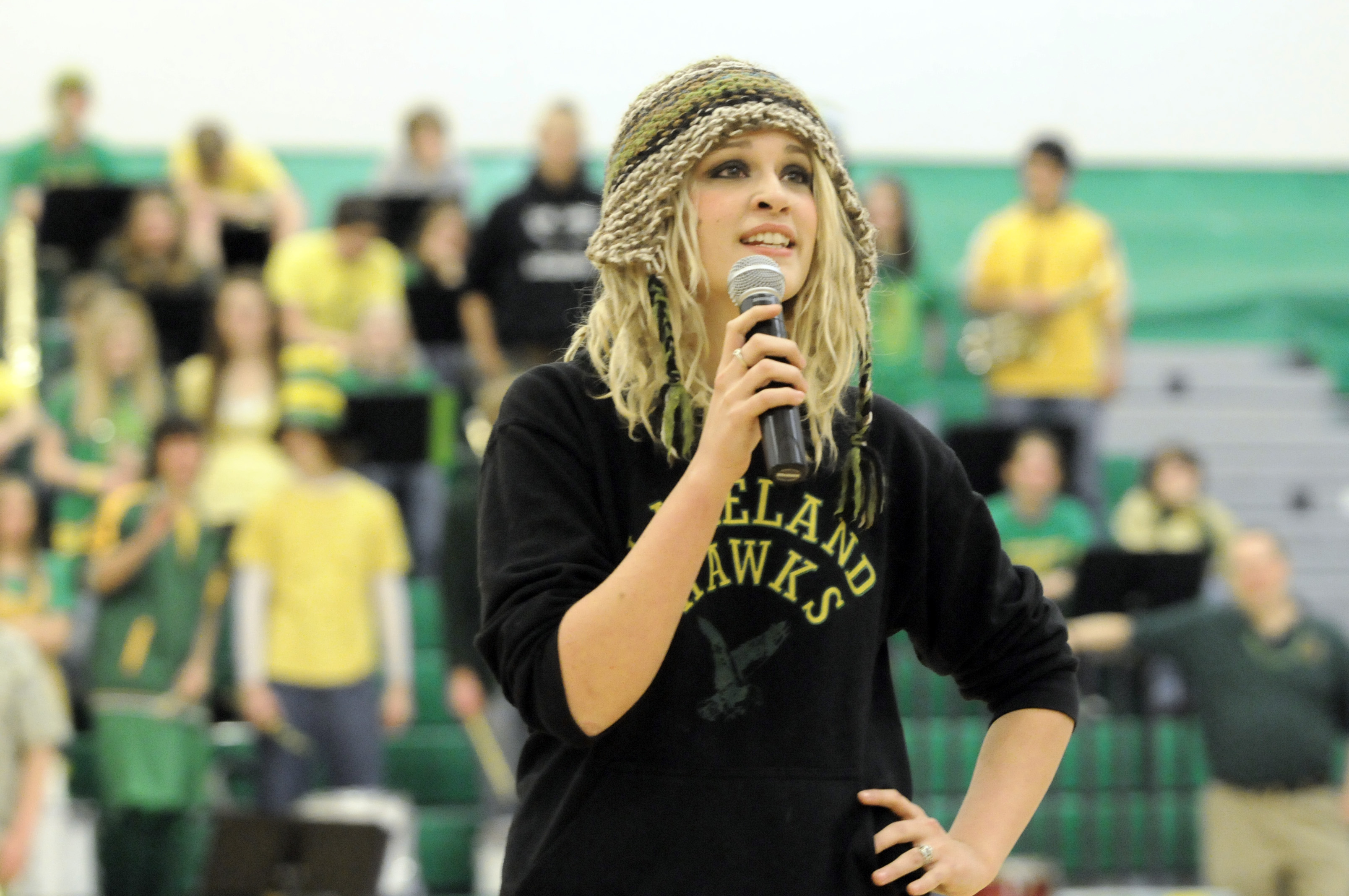 Rathdrum teenager Rose Flack jokes with her former classmates at Lakeland High School Thursday. Flack came back to the school to say hello at a pep assembly the day after she was featured as a contestant on American Idol. All she could say about the show was that she was one of the 13 or so contestants chosen to go to Hollywood from the Salt Lake City auditions. Story here . Video of Rose’s ‘American Idol’ audtion here . (Jesse Tinsley/SR)