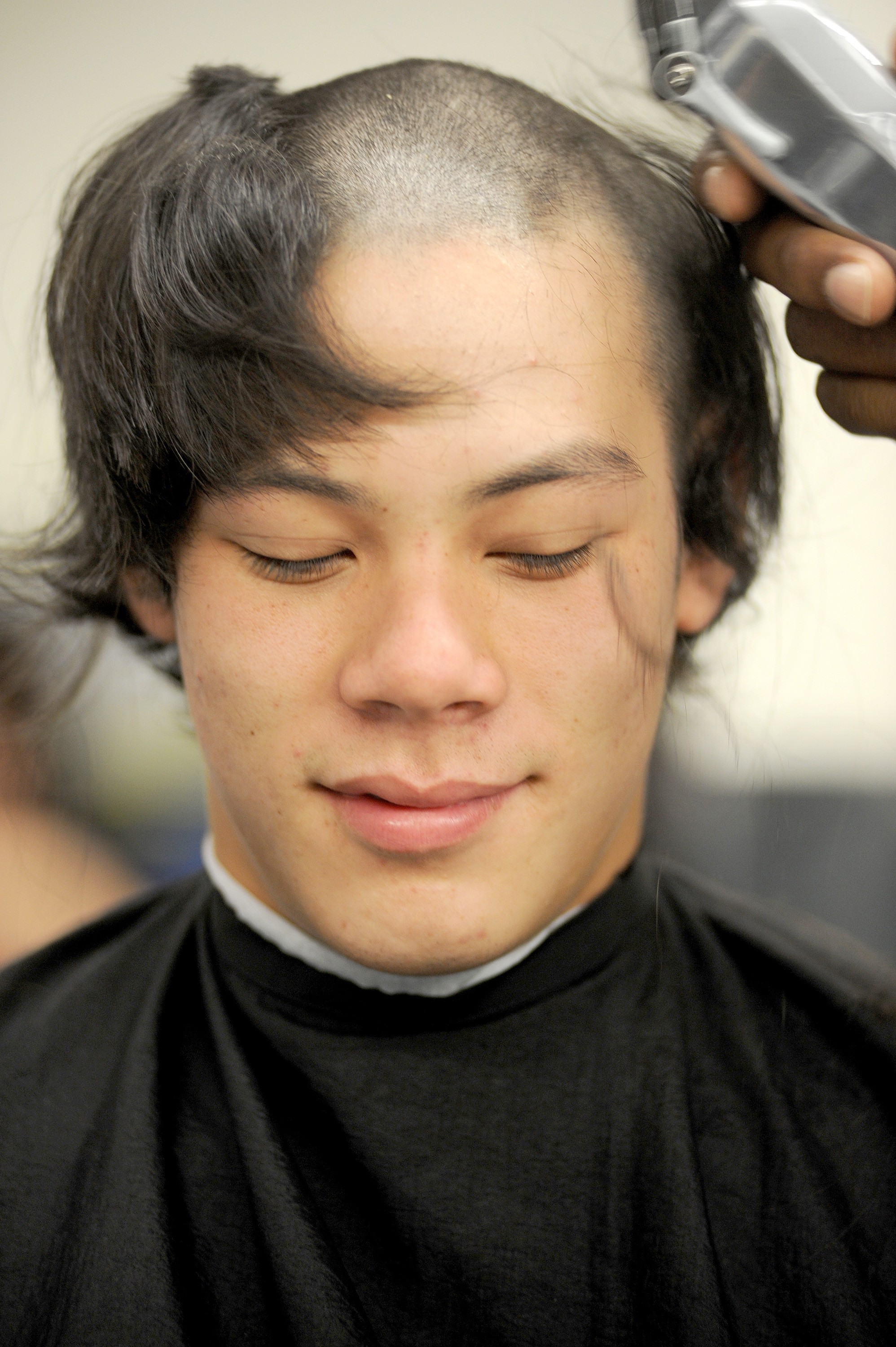 Jonathan Desimone, 18, of Burbank, Calif., has his head shaved during Induction Day at the Naval College in Annapolis, Maryland Wednesday. “I-day,” the first day of Plebe Summer, is known as the day in which selected applicants are transformed from civilians into midshipmen. You write the cutline. (AP Photo/Jamie C. Horton)