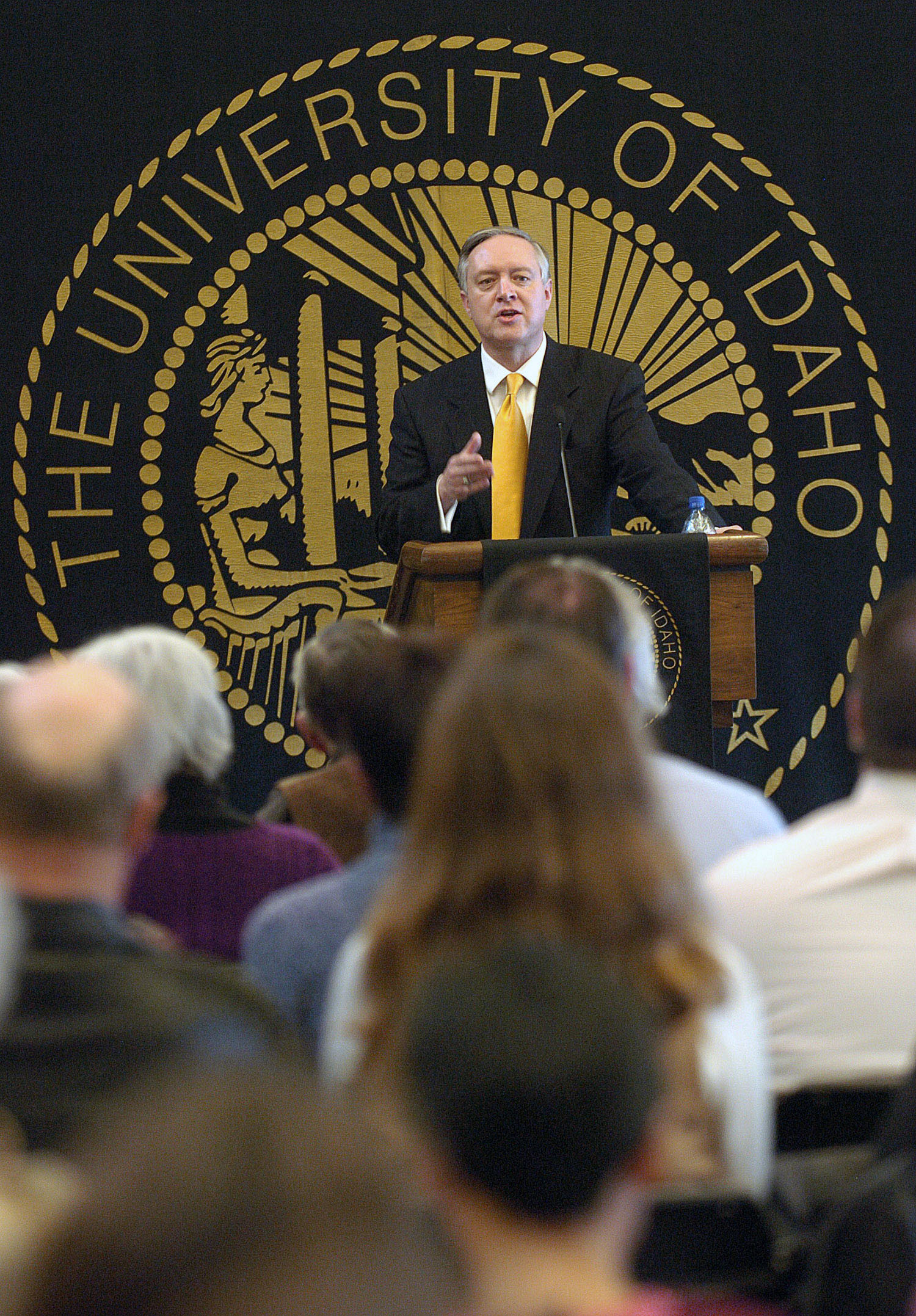 In this Feb. 3 file photo, University of Idaho presidential candidate Duane Nellis speaks at a public forum during his official visit in Moscow, Idaho. Nellis, The new president of the University of Idaho says he is well aware of the high expectations tied to his new job, but he’s also convinced he’s the right person to lead the school. He began his tenure as UIdaho’s 17th president this morning. Lewiston Tribune story here . (AP Photo/Lewiston Tribune, Kyle Mills, file)