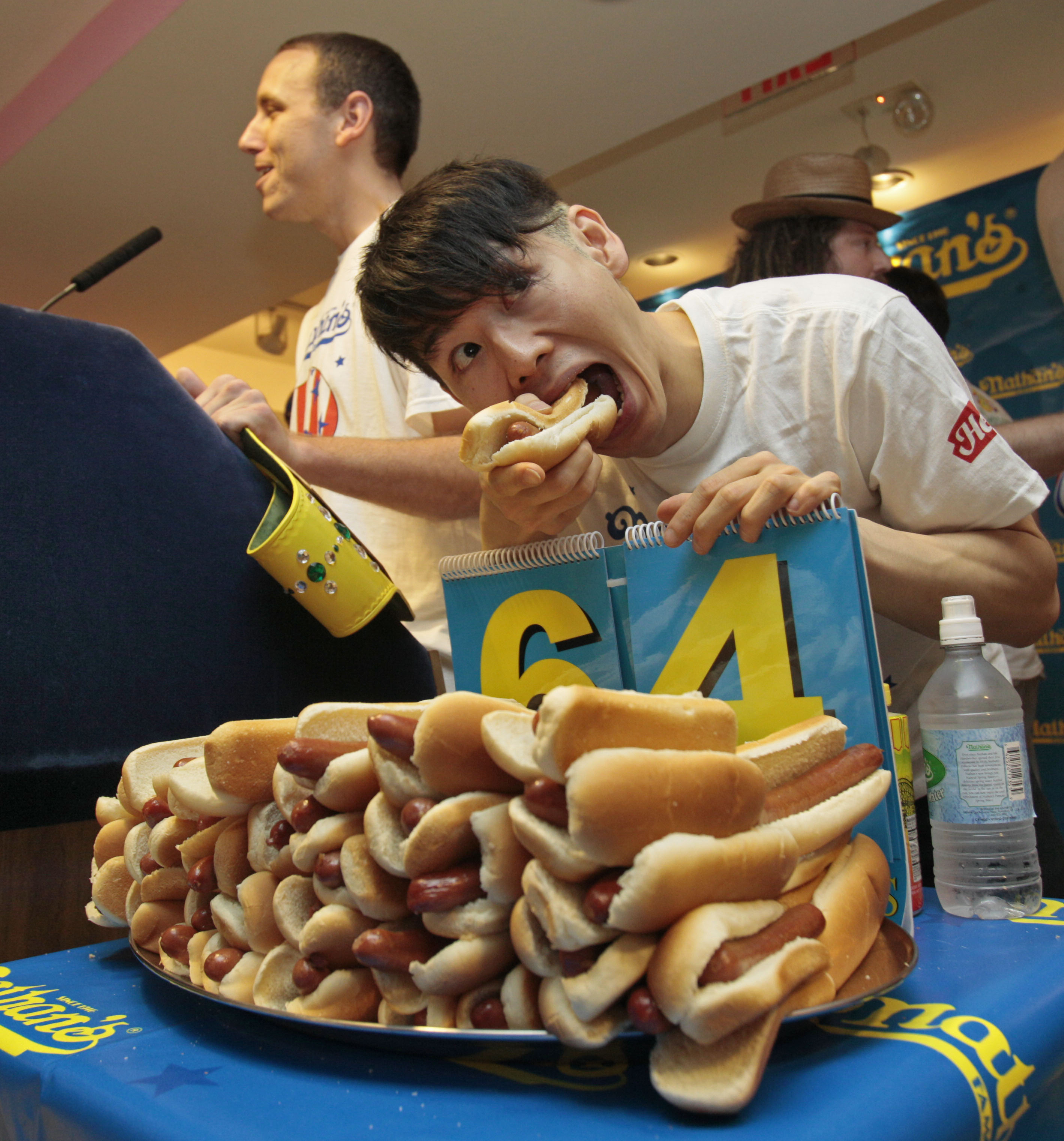 Joey Chestnut, left, of San Jose, Calif., defending champion of the Nathan’s Famous July 4th Hot Dog Eating Contest, answers media questions as former champion Takeru Kobayashi, of Nagano, Japan, poses for photos in New York Thursday. (AP Photo/Richard Drew)