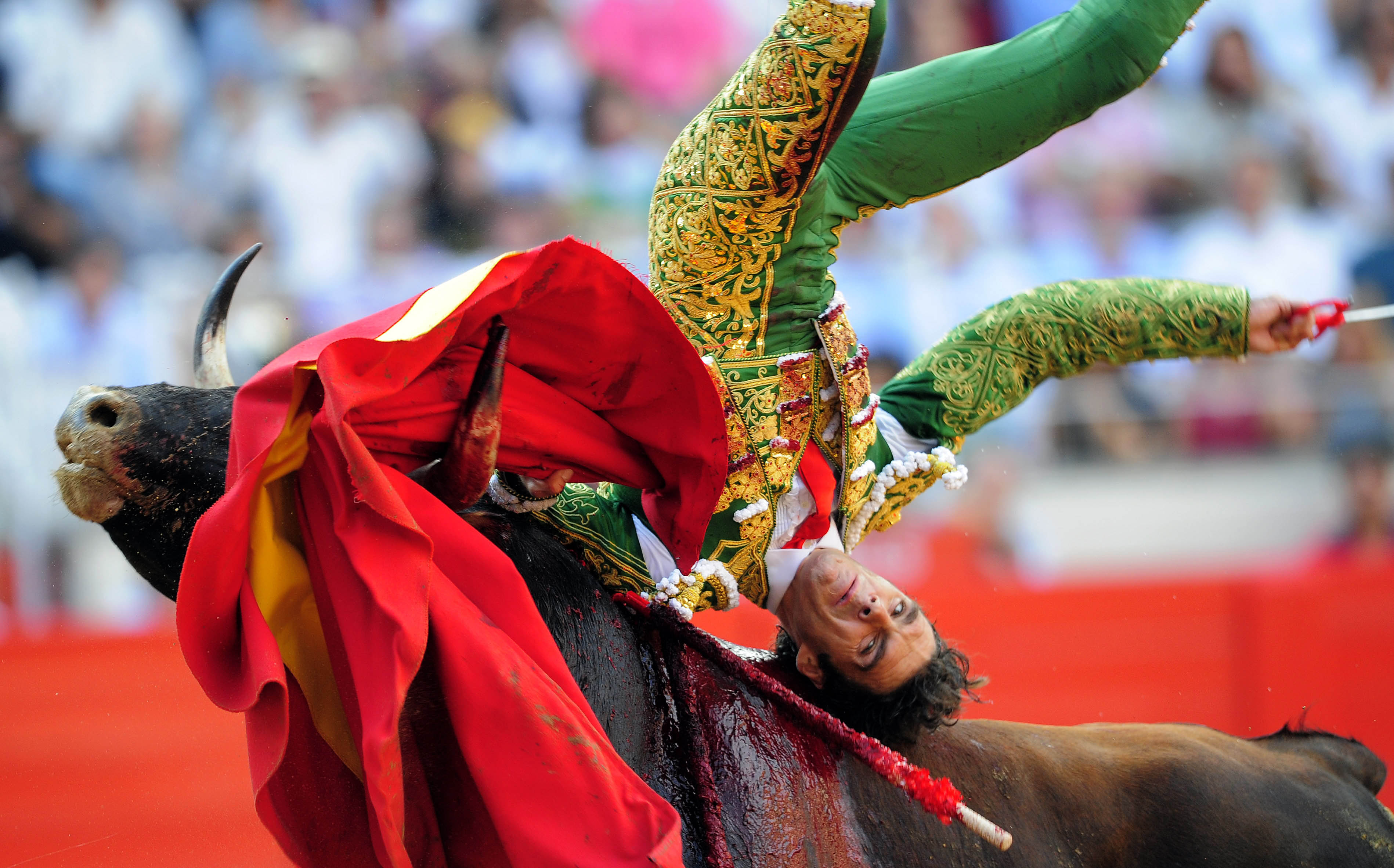 Since the first APhoto of the Day attempt didn’t draw much attention, I’ll try again. (And if this doesn’t work, I have PETA guys & dolls protesting the bullfight and a Canada Bare Buns fun run in reserve.) Here, Spanish bullfighter Jose Tomas is gored by a bull during a bullfight at the Monumental Bullring in Barcelona, Spain, Sunday. You write the cutline. (AP Photo/Manu Fernandez)