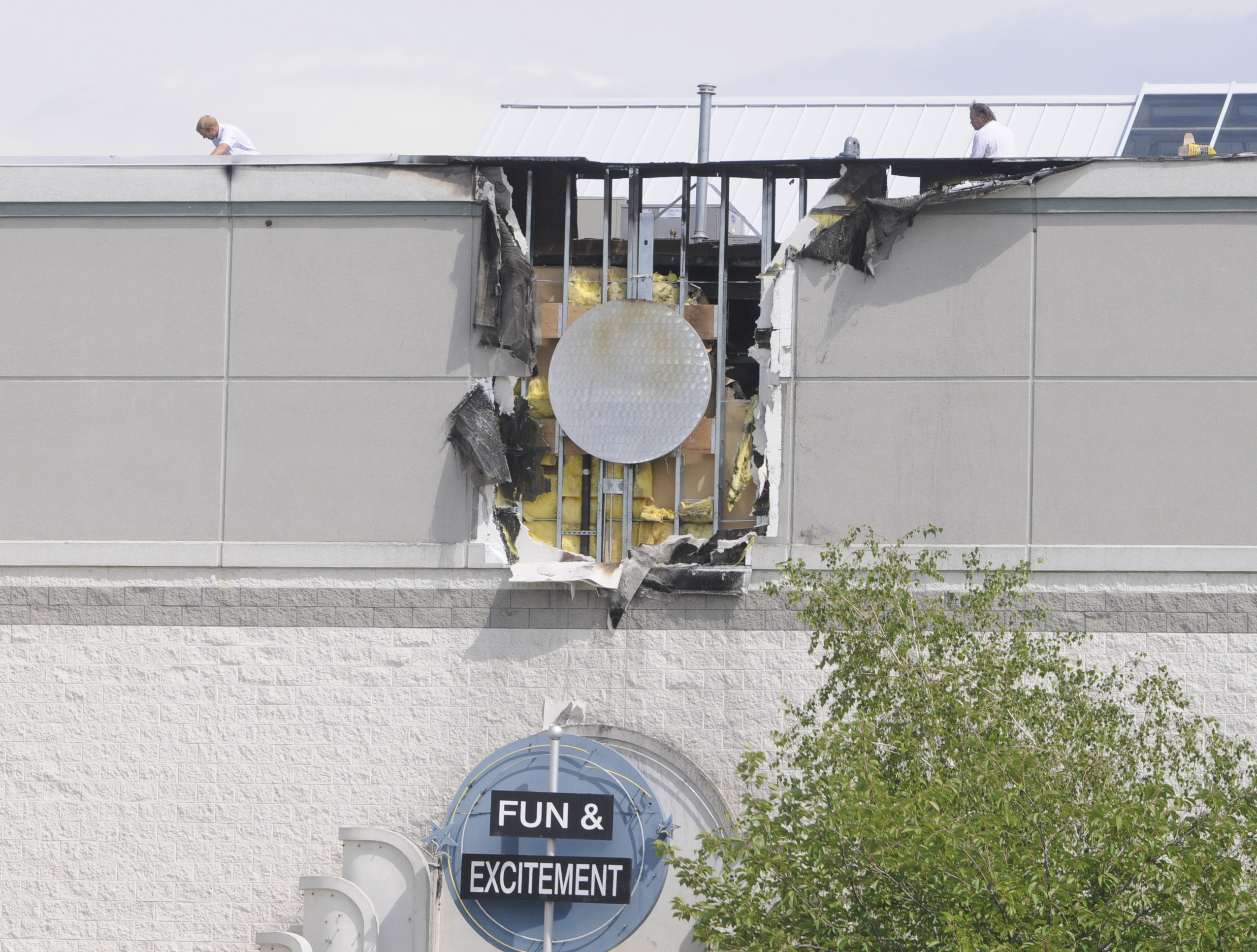 Men work on top of the Spokane Valley Mall this morning where an electrical fire behind a decorative medallion damaged the facade Monday morning. The fire is just above Tilt, the video game arcade and the arcade will reopen once the facade is repaired. (Jesse Tinsley/SR)