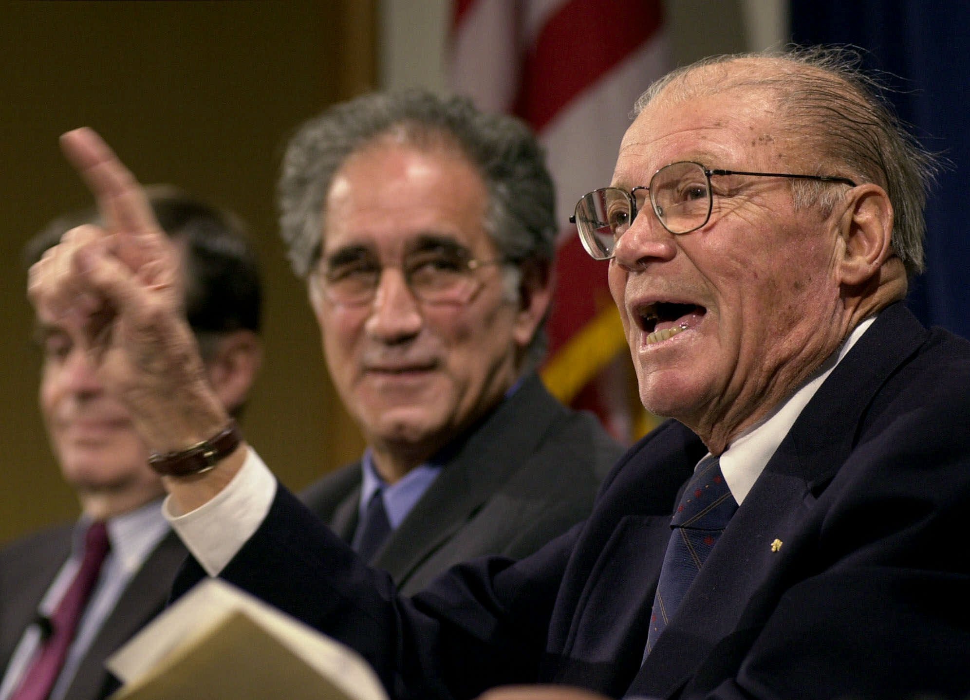 In a February 2001 file photo, Robert McNamara, right, defense secretary under Presidents Kennedy and Johnson, makes a point as Peter Almond, center, co-producer of the film “Thirteen Days,” looks on during a forum at the John F. Kennedy School of Government at Harvard University in Cambridge, Mass. Former Defense Secretary Robert S. McNamara died Monday, July 6, 2009, according to his wife. He was 93. Theodore Sorensen, former special counsel to President Kennedy, is at left. Story here . (AP Photo/Steven Senne, File)