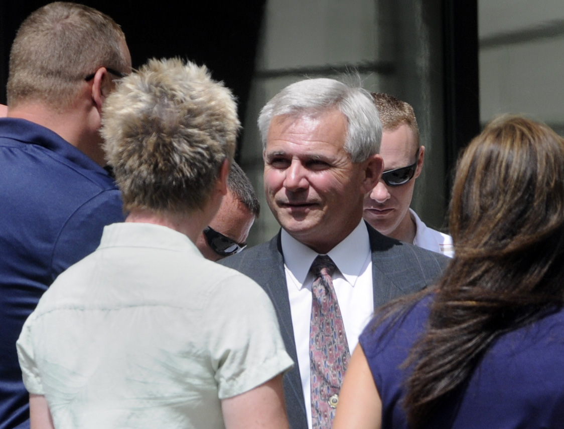 Spokane Police officer Karl Thompson (with silver hair) talks friends and supporters outside the Federal Courthouse in Spokane where he appeared today to answer charges in the Otto Zehm case. (Jesse Tinsley/SR)