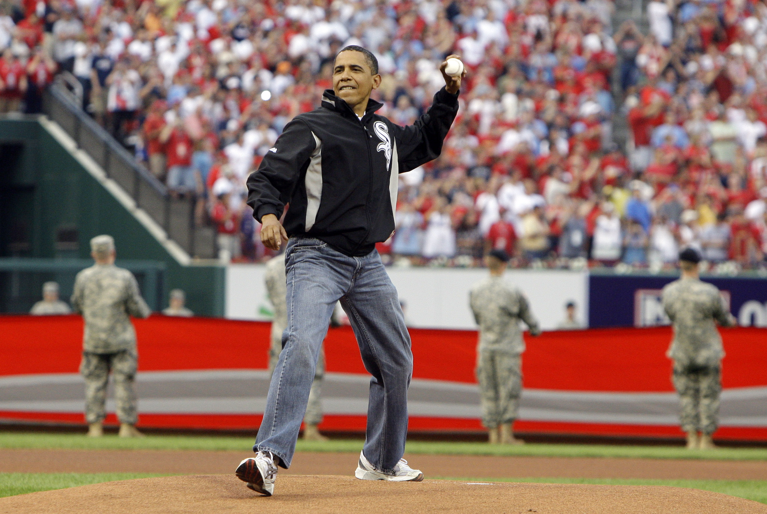 President Barack Obama throws out the first pitch to St. Louis Cardinals first baseman Albert Pujols, not pictured, before the MLB All-Star baseball game in St. Louis Tuesday. (AP Photo/Haraz N. Ghanbari)