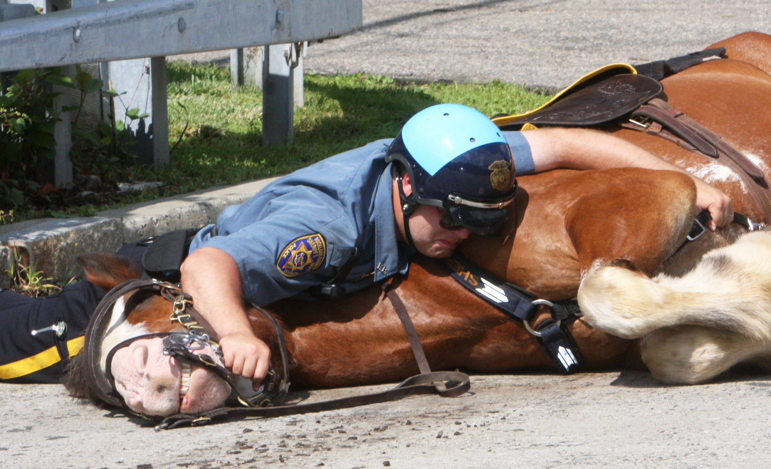 Rockland County Sheriff’s Dept. Offiicer Gerrett Clapp lies over his horse Coughlin, after the horse fell when he stepped on a metal plate, Saturday in Stony Point, N.Y.. They were on the East Main Street bridge in Stony Point on their way to the Waldron Revolutionary War Cemetery re-dedication ceremony. Officers at the scene thought Coughlin broke his leg. The distressed Officer Clapp pushed him to the ground to avoid further injury. It turned out only to be a stretched muscle. He will get further examination later, but is expected to return to his duty shortly. (AP Photo/The Journal News, Seth Harrison)