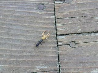 An ant can lug 100 times his own weight so this one is hardly stretched to trundle off with a tasty white spider.