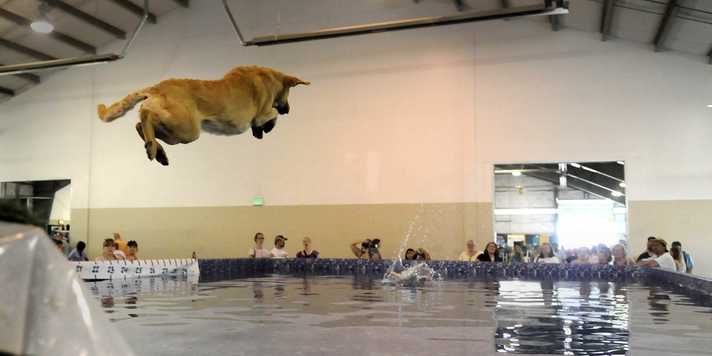With his eye on the thrown training decoy, a Chesapeake Bay Retriever named Kiowa hangs in mid-air before plunging into a pool during the dock diving competition Saturday at PetFest, the weekend festival for pets and their owners at the Spokane County Fair and Expo Center. Kiowa is owned by Gigi Grant of Hayden Lake. Besides the many opportunities to show off, pet owners could also talk with vendors of pet supplies and with various animal welfare agencies. (Jesse Tinsley/SR)