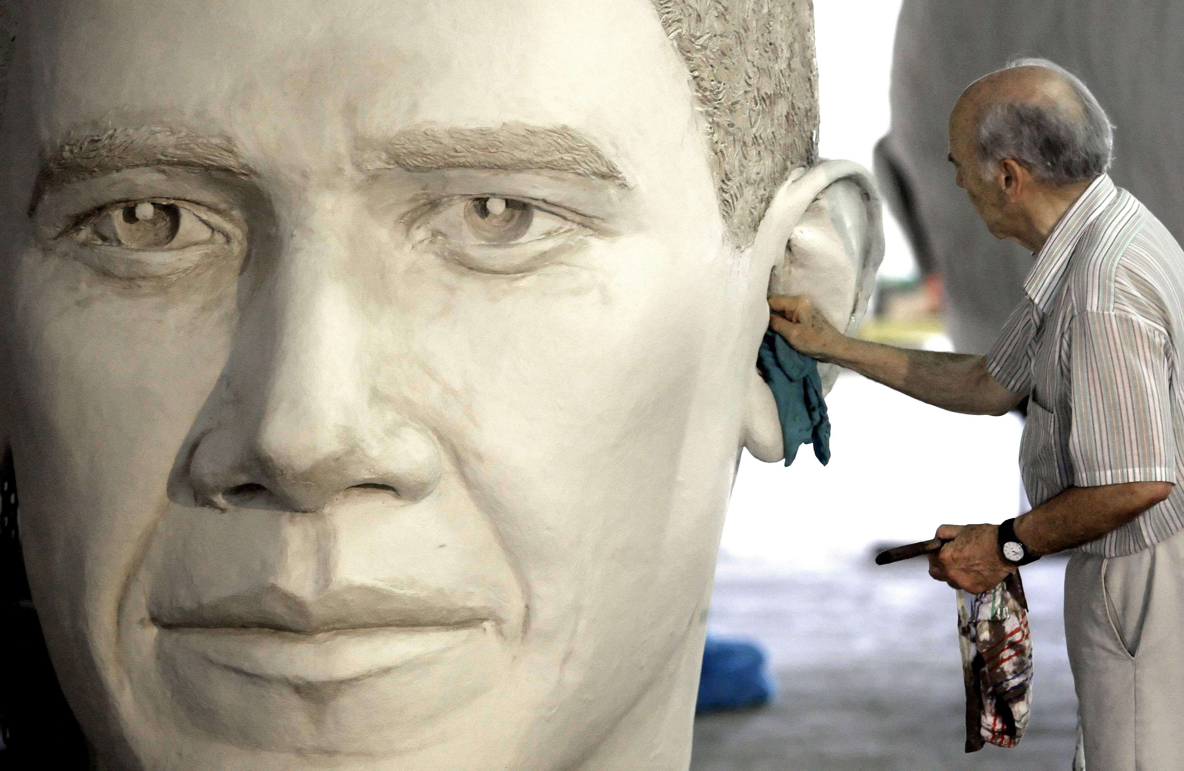Sculptor David Adickes works on his sculpture of President Barack Obama Tuesday at his studio in Houston. The 18 foot tall statue will be installed at President’s Park in South Dakota where Adickes’ sculptures of the previous 43 presidents are currently displayed. (AP Photo/David J. Phillip)