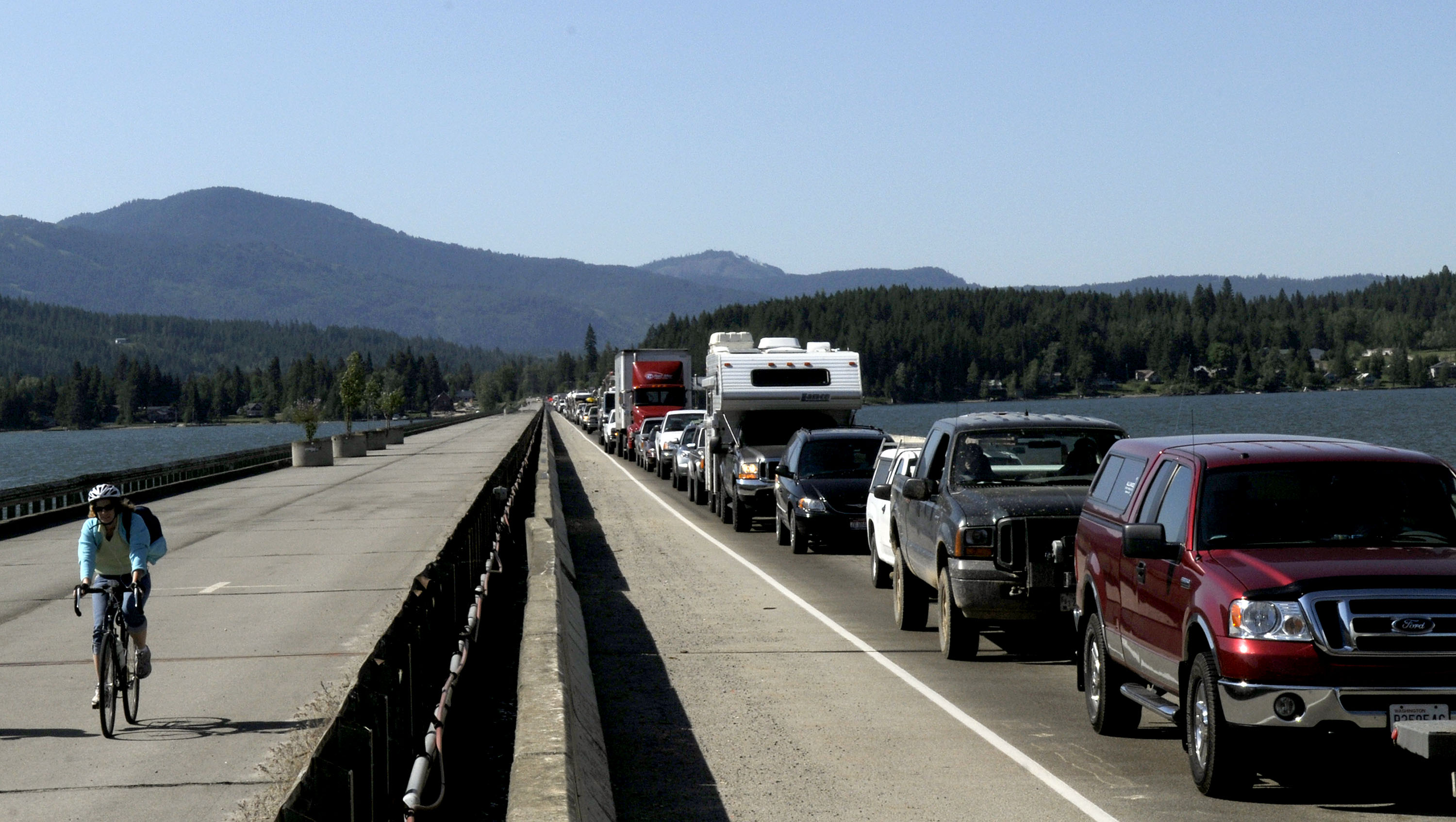 Traffic was backed up on the Long Bridge in Sandpoint on Wednesday. Since the Sandcreek Byway construction started, summer traffic through Sandpoint, which is usually a snarl, has been worse than usual. Motorists are reporting sitting on the Long Bridge backed up for 45 minutes at a time. (Kathy Plonka/SR)