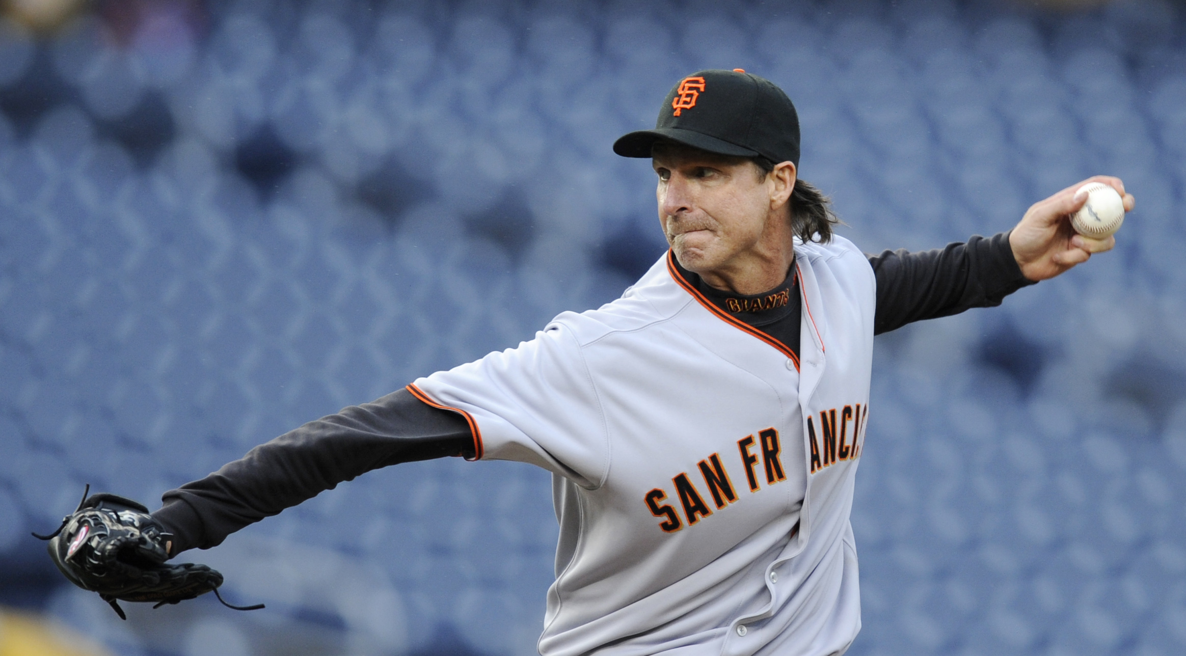 San Francisco Giants starter Randy Johnson delivers a pitch against the Washington Nationals during the first inning of the first game of a baseball doubleheader earlier today in Washington. Moments ago, Johnson became the second oldest player, at 45, to win his 300th ballgame when San Francisco beat Washington 5-1. Story here . Boxscore here . (AP Photo/Nick Wass)