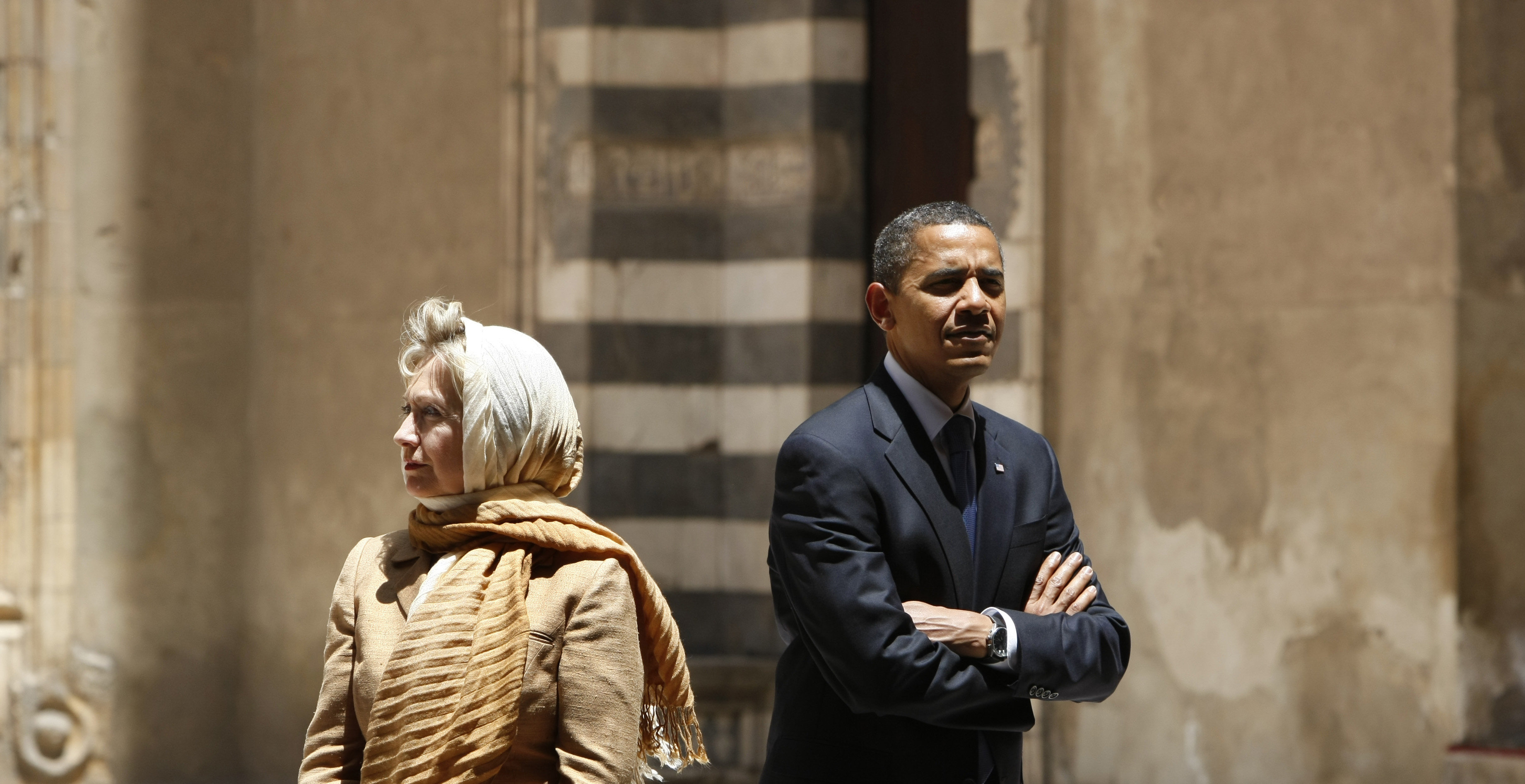 U.S. President Barack Obama, right, tours the Sultan Hassan Mosque with Secretary of State Hillary Rodham Clinton, left, in Cairo, Egypt, today. Obama arrived in Egypt for high level meetings before delivering a much heralded speech to an audience at Cairo University.(AP Photo/Gerald Herbert)
