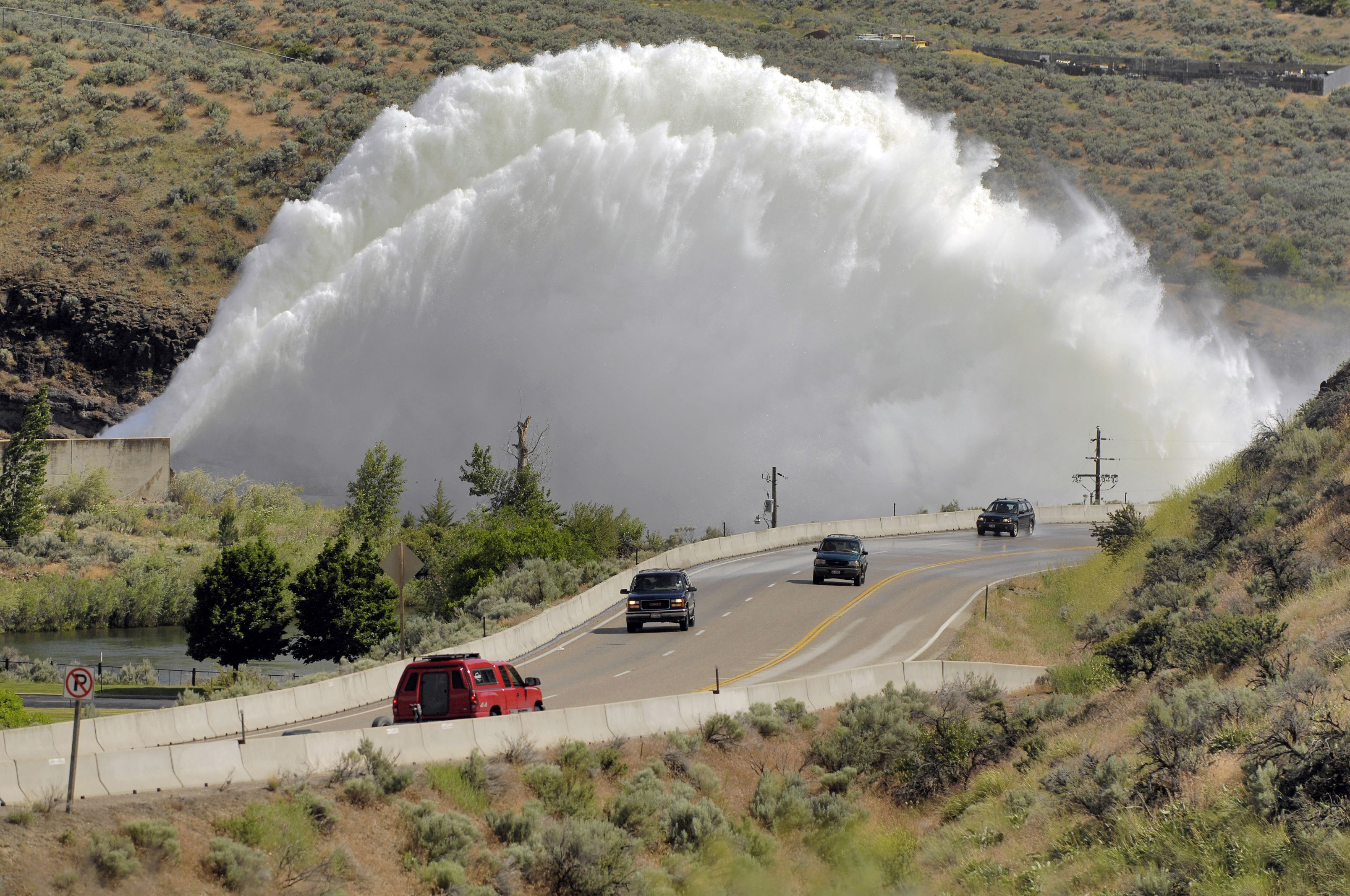 Motorists drive down U.S. Highway 21 as water soars dozens of feet into the air in the formation referred to as the “rooster tail” on Thursday at Lucky Peak Dam outside Boise. The unique water display occurs when excess water is diverted through the dam’s outlet slide gates before landing in the Boise River. (AP Photo/Idaho Press-Tribune, Charlie Litchfield)