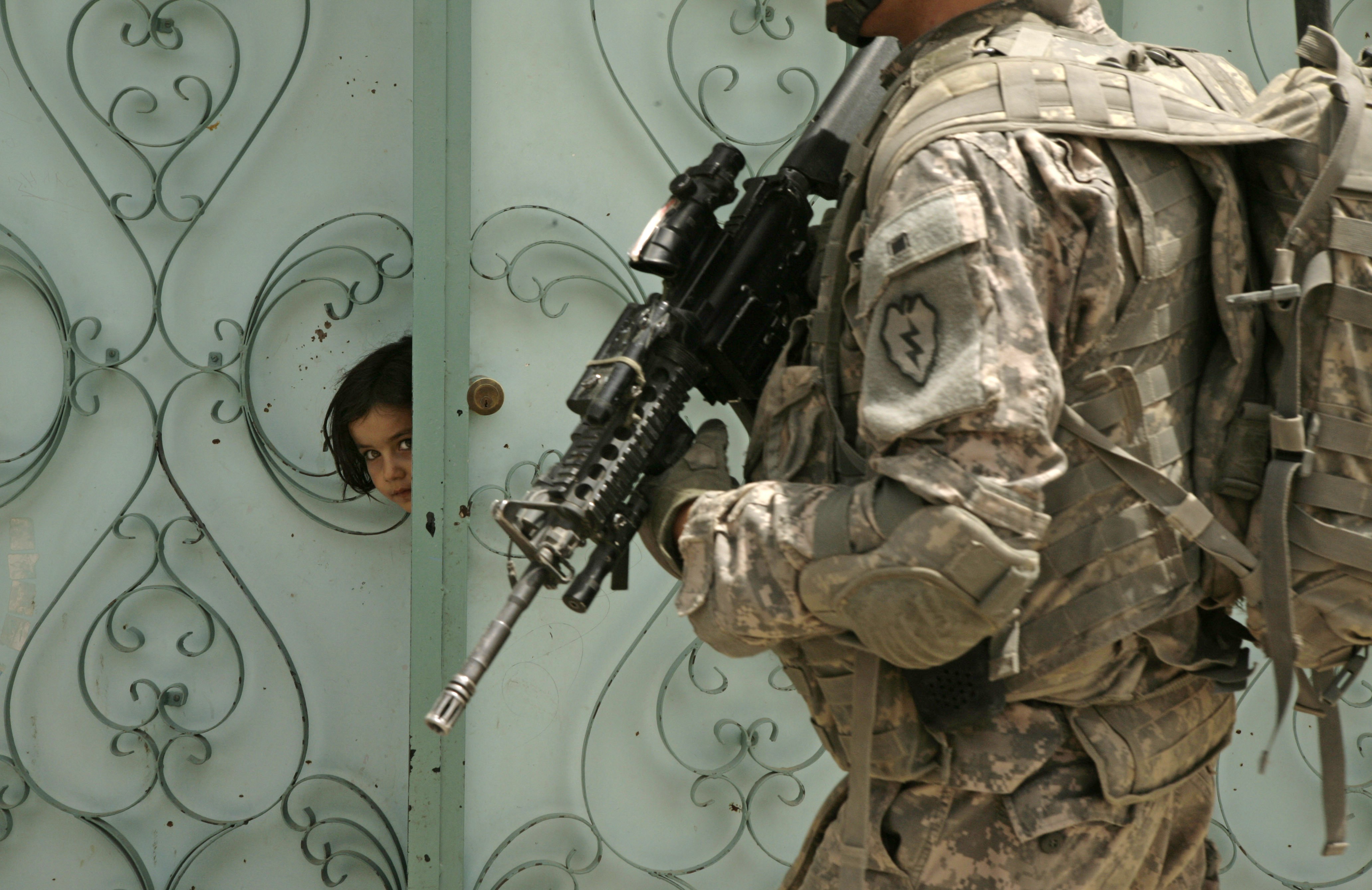 A girl peers from her front gate as a U.S. Army soldier from A Co., 1st Battalion, 5th Infantry Regiment patrols in western Mosul, 360 kilometers (225 miles) northwest of Baghdad, Iraq, Tuesday. (AP Photo/ Maya Alleruzzo)