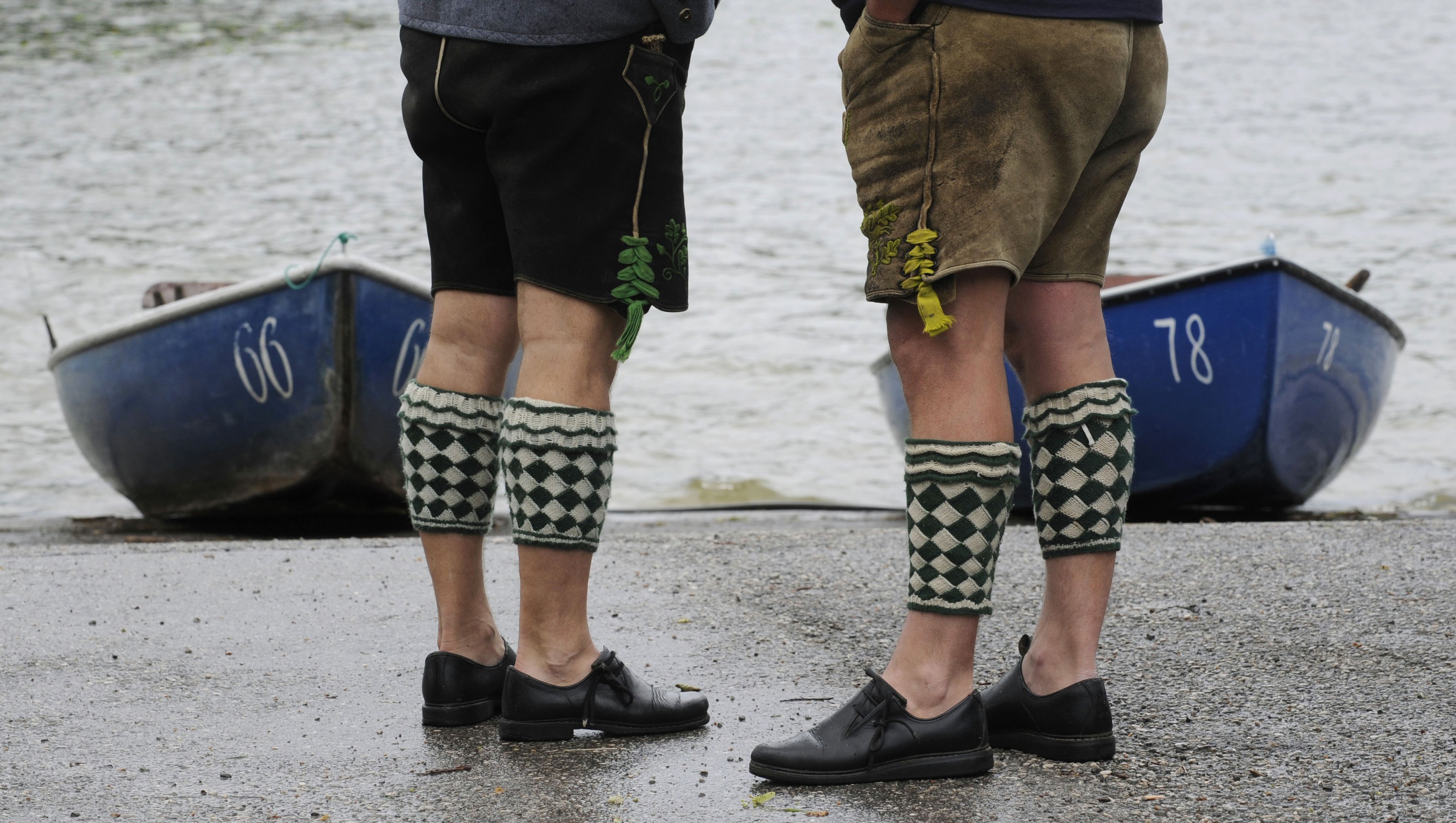 Men dressed in traditional Bavarian clothes stand in front of rowing boats tied at the banks of lake Staffelsee in Seehausen, southern Germany, earlier today. You write the cutline.