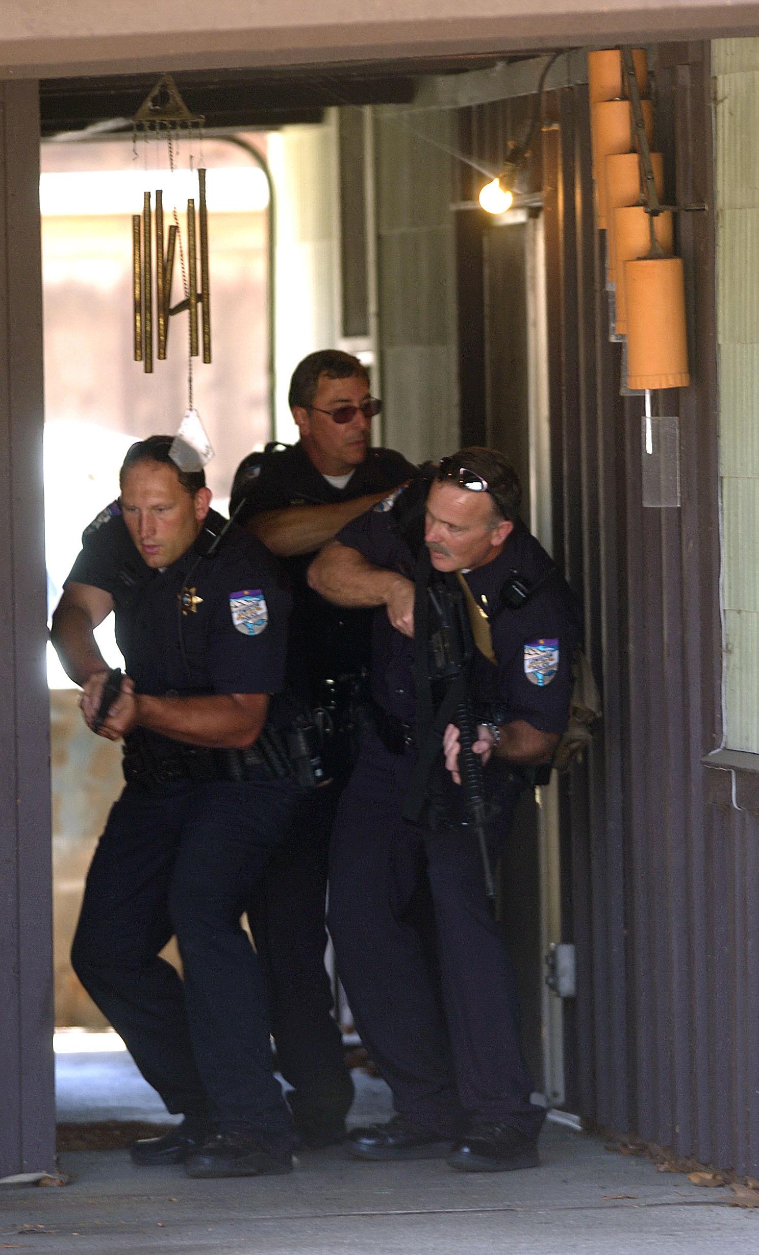 Lewiston police officers make their way through a breezeway of a home west of Albertsons grocery store looking for a pharmacy robbery suspect Wednesday. (AP Photo/Lewiston Tribune, Kyle Mills)