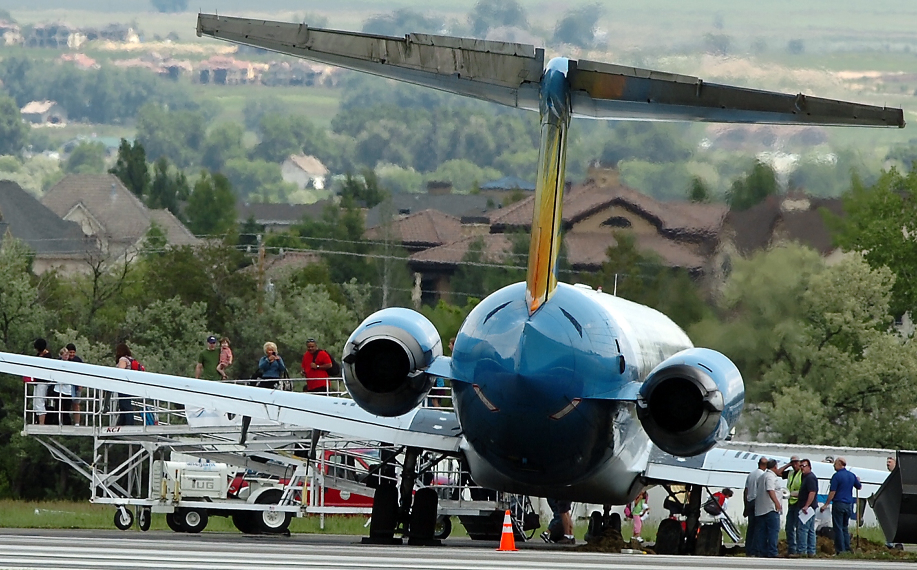 Passengers exiting an Allegiant airplane take photos and get a better look at the mud the plane was stuck in after landing at the Fort Collins-Loveland Municipal Airport in Fort Collins, Colo., Friday. Passengers were taken by buses to the terminal. (AP Photo/Loveland Reporter-Herald, Jenny Sparks)