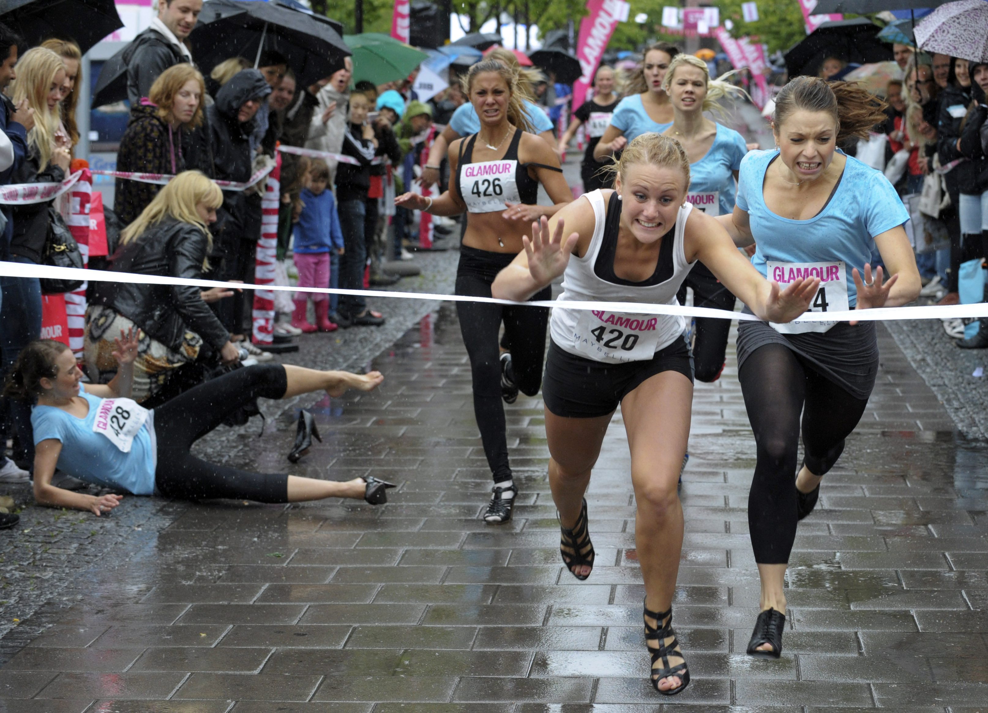 Elin Bjerre from the city of Kristianstad in southern Sweden, centre, stumbles over the finish line to win the 100 meters final in the Stiletto Run, as another competitor falls to the ground, during the event held in Stockholm, Sweden, Saturday. Bjerre won 10000 Euro worth of shopping. You write the cutline. (AP Photo / Leif R Jansson, SCANPIX)