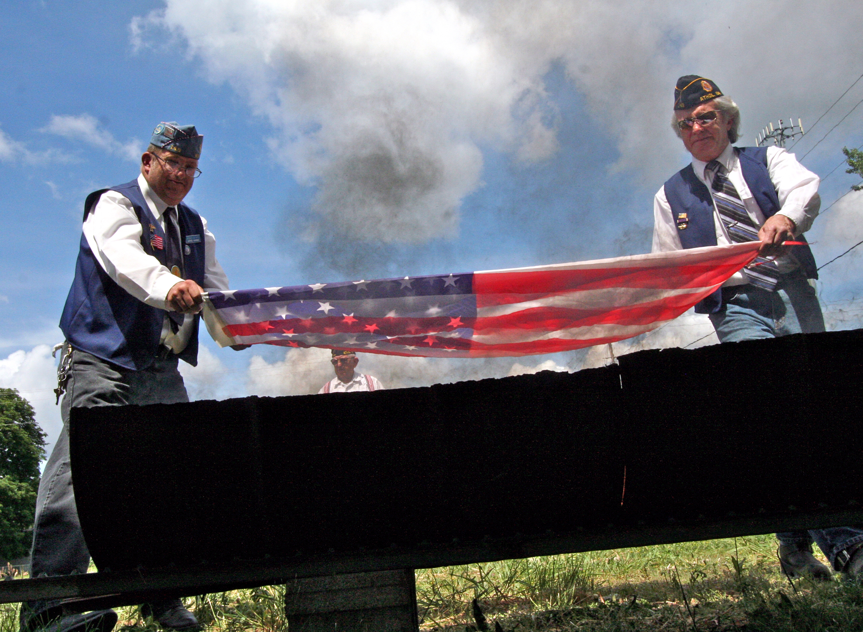 David Harms and Gary Paschke of American Legion Post 149 prepare a flag for disposal during a flag retirement ceremony on Flat Day Sunday at the post in Athol. More than 25 people attended a flag retirement ceremony at the Post 149 on Sunday afternoon. Members of the American Legion and Sons of the American Legion were assisted by Boy Scouts from Athol Troop 218. Several flags were properly disposed of during the flag retirement ceremony. (Photo: Taryn A. Hecker Photography Studio, Spirit Lake)