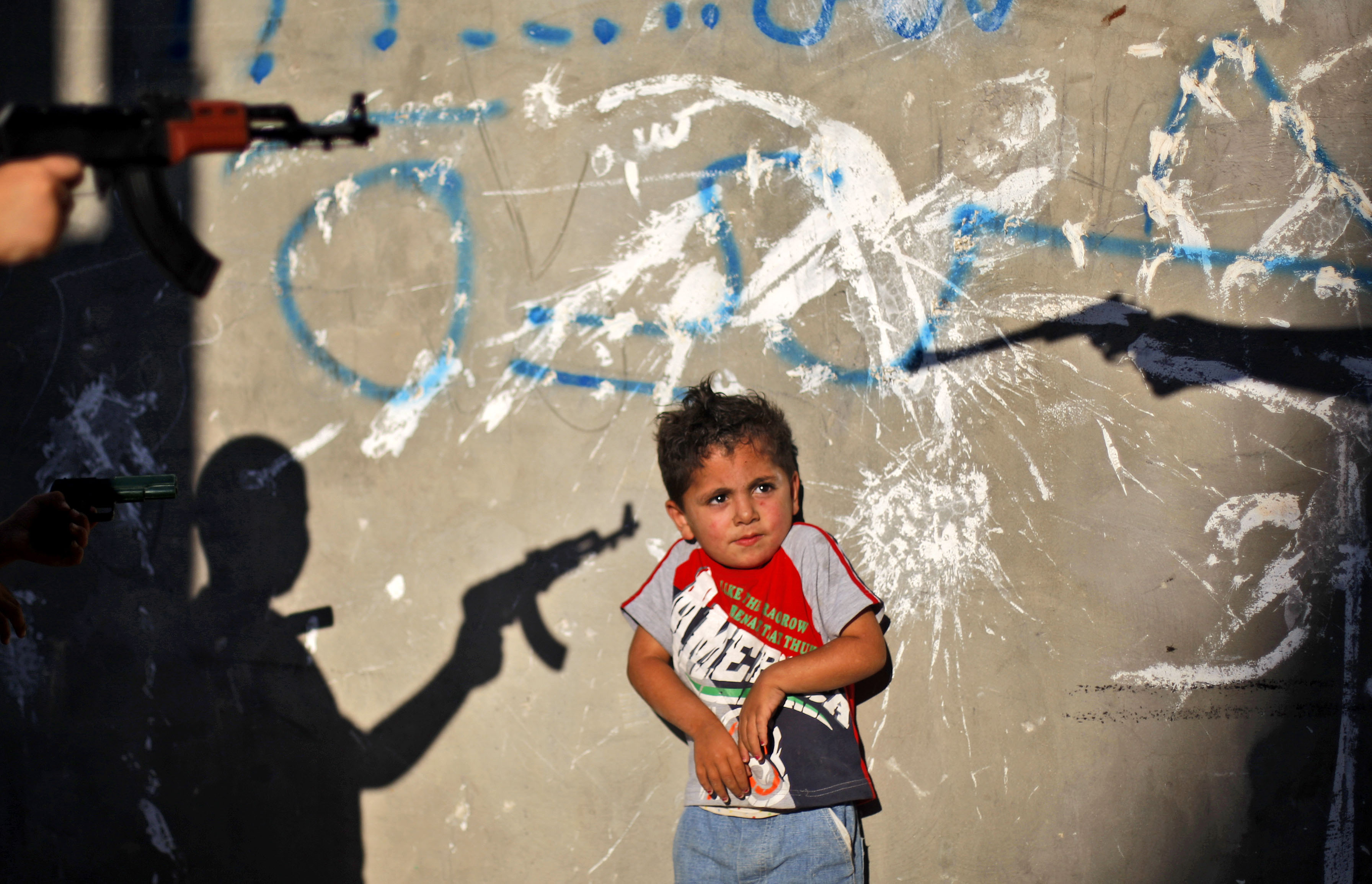 A Palestinian boy reacts as youths frighten him by pointing their toy guns at him, in an alley in the West Bank refugee camp of Al-Amari in Ramallah Tuesday. (AP Photo/Muhammed Muheisen)