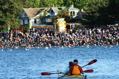 “Ironman Coeur d’Alene will begin with the elite athletes spilling into Lake Coeur d’Alene en masse at 7 a.m. Sunday,” reports Councilwoman KerriT/ OnLocation North Idaho . “I love seeing the sea of humanity as nearly 2,000 wet-suited competitors flow like lava off of city beach into the water for their 2-mile swim. Amazing to think that many of them will not be crossing the finish line in downtown Coeur d’Alene for at least 12 hours from the time they hit the water for the swim leg. They will ride 112 miles on bicycles and then run a full 26.2 mile marathon before being declared Ironmen.”
