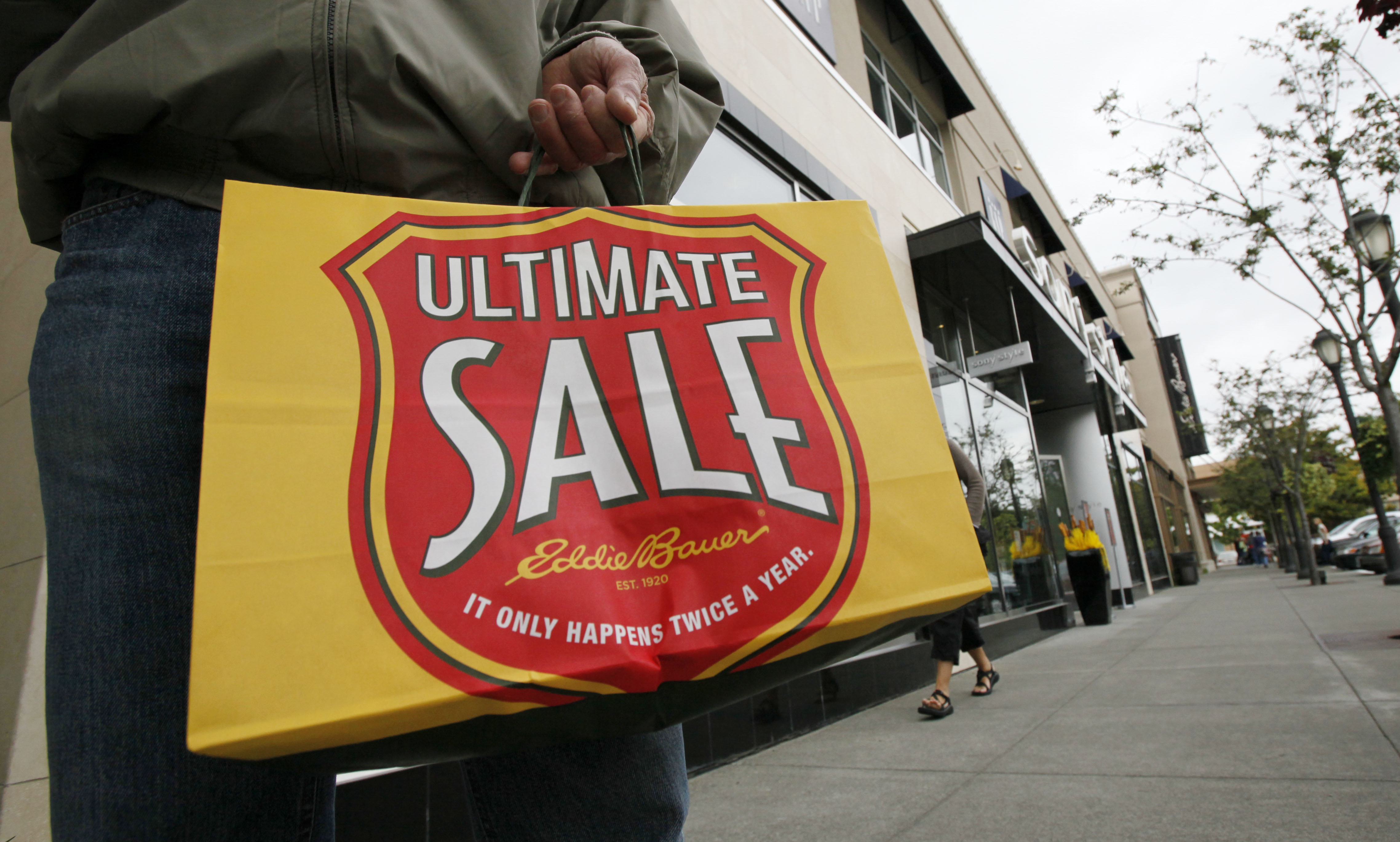 A shopper clutches a bag after leaving an Eddie Bauer store Wednesday in Seattle. Struggling mall retailer Eddie Bauer Holdings Inc. filed for Chapter 11 bankruptcy protection on Wednesday but said a bidder already has agreed to keep the majority of its 371 stores open, honor gift cards and hold onto most employees. Story here . (AP Photo/Elaine Thompson)